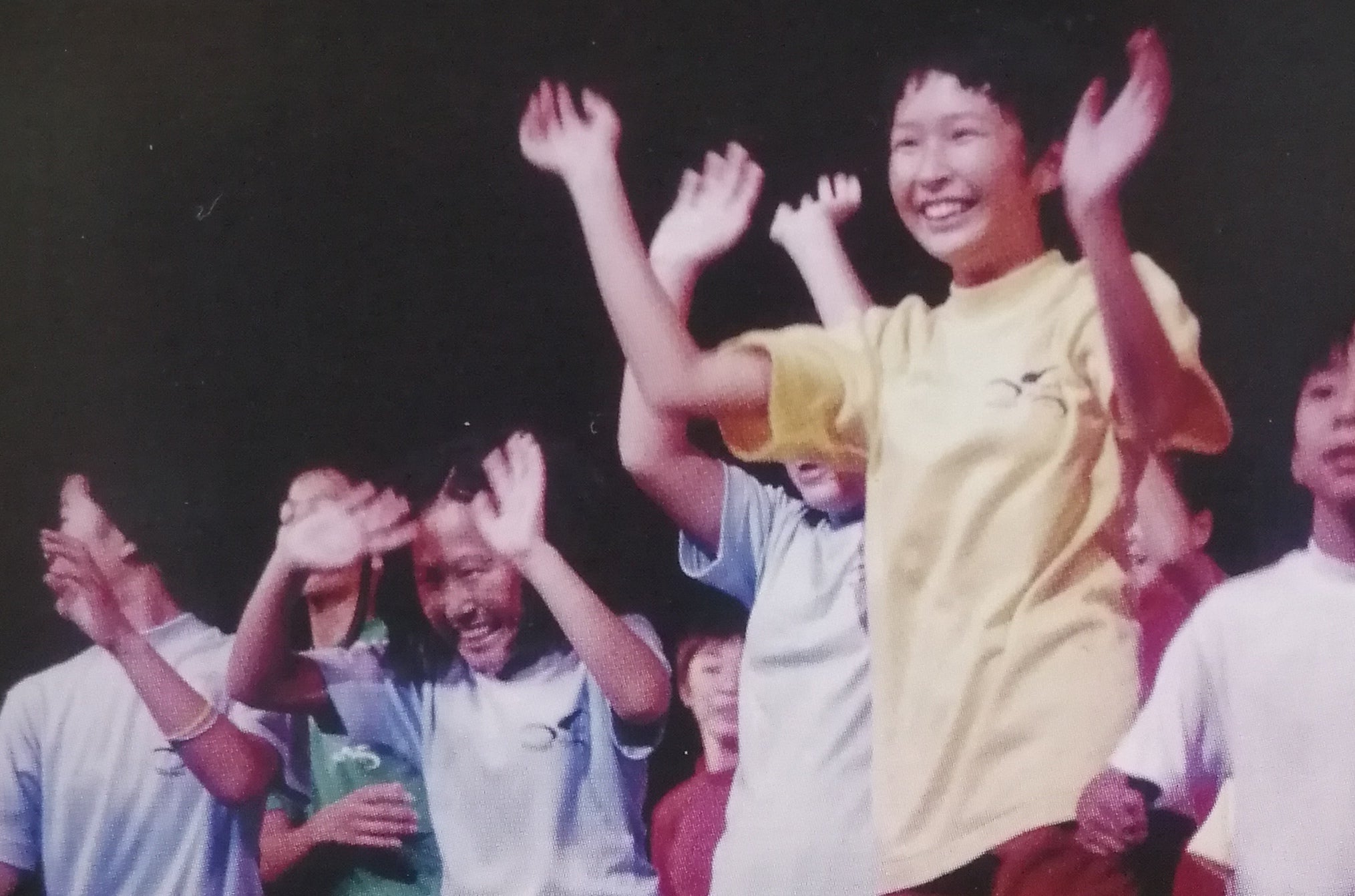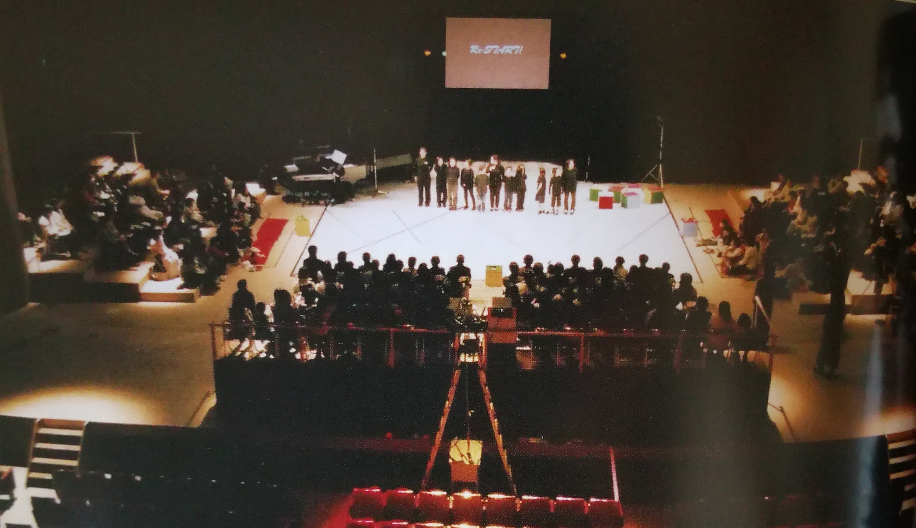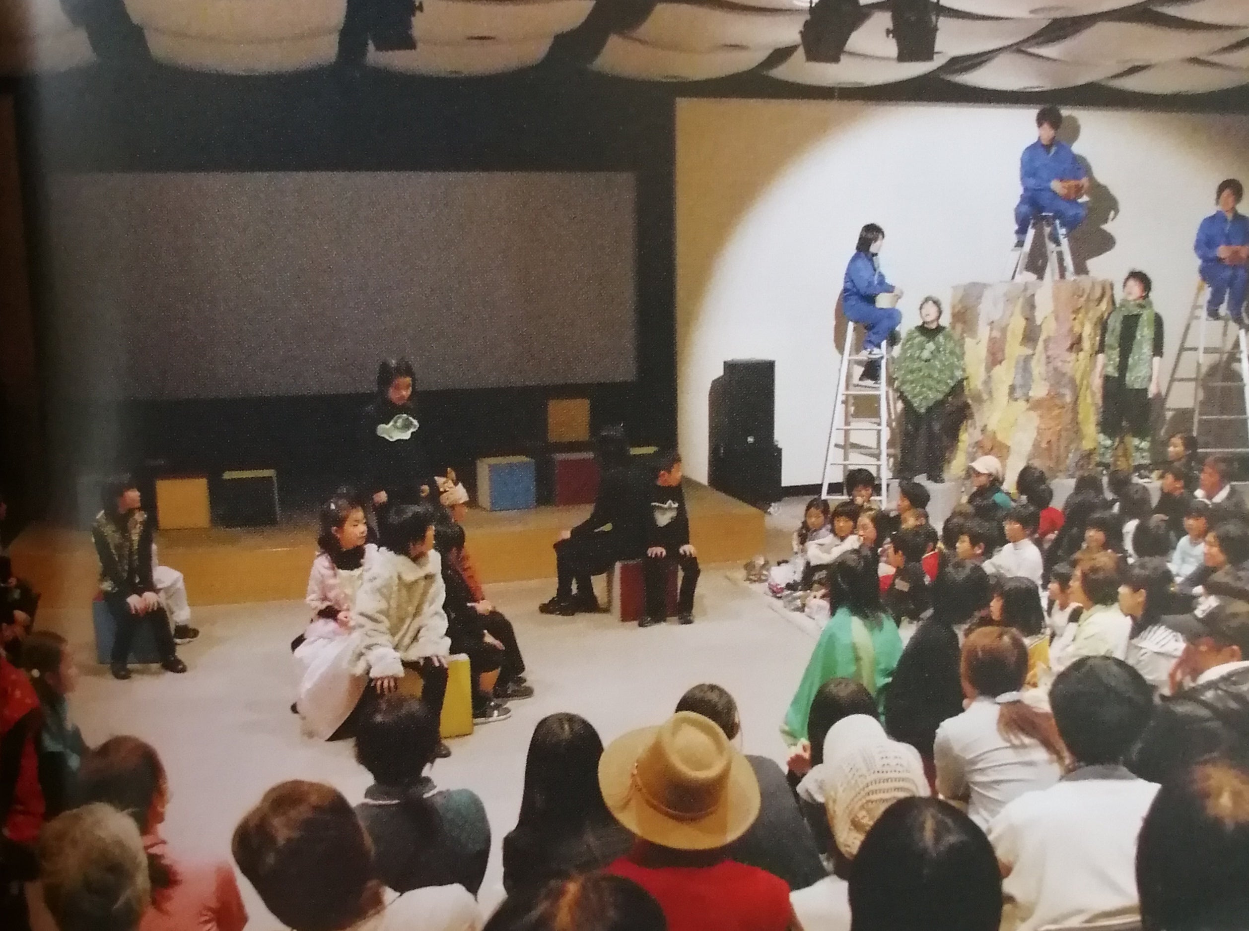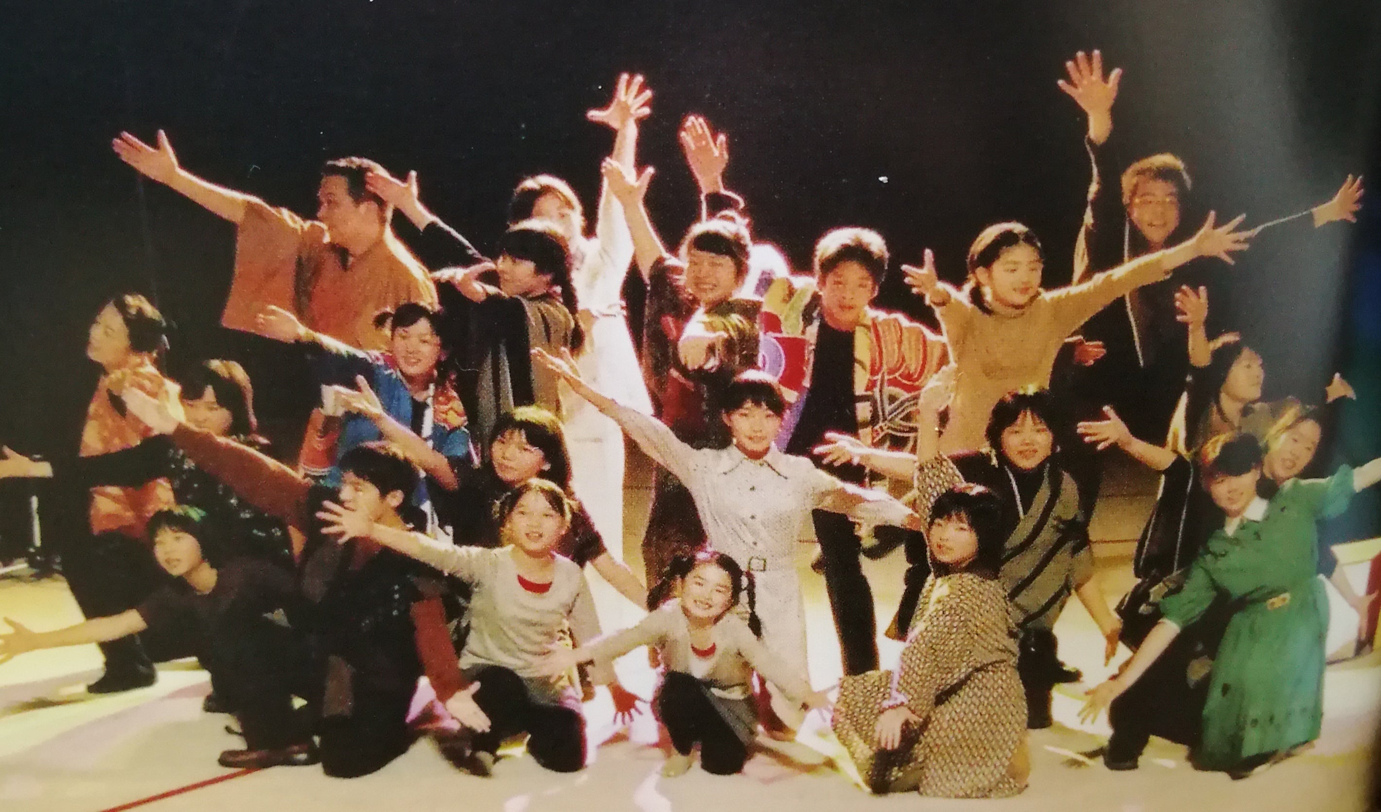1996年、福岡県と福岡県の子ども劇場の共同事業で「子どもの芸術・創造表現活動育成事業」が企画され、全国で初めて「参加者である子どもたち自身の言葉から歌やストーリーを作る」創造表現活動からのミュージカル舞台公演が実施されました。日本で数少ないドラマ教育の専門家を東京から講師として招き、子どもの言葉からの作曲をクニ河内さんが担当し、約1年半の活動を経て、1997年夏に福岡市(参加した子ども100名)と飯塚市(50名)で発表公演が行われたのです。