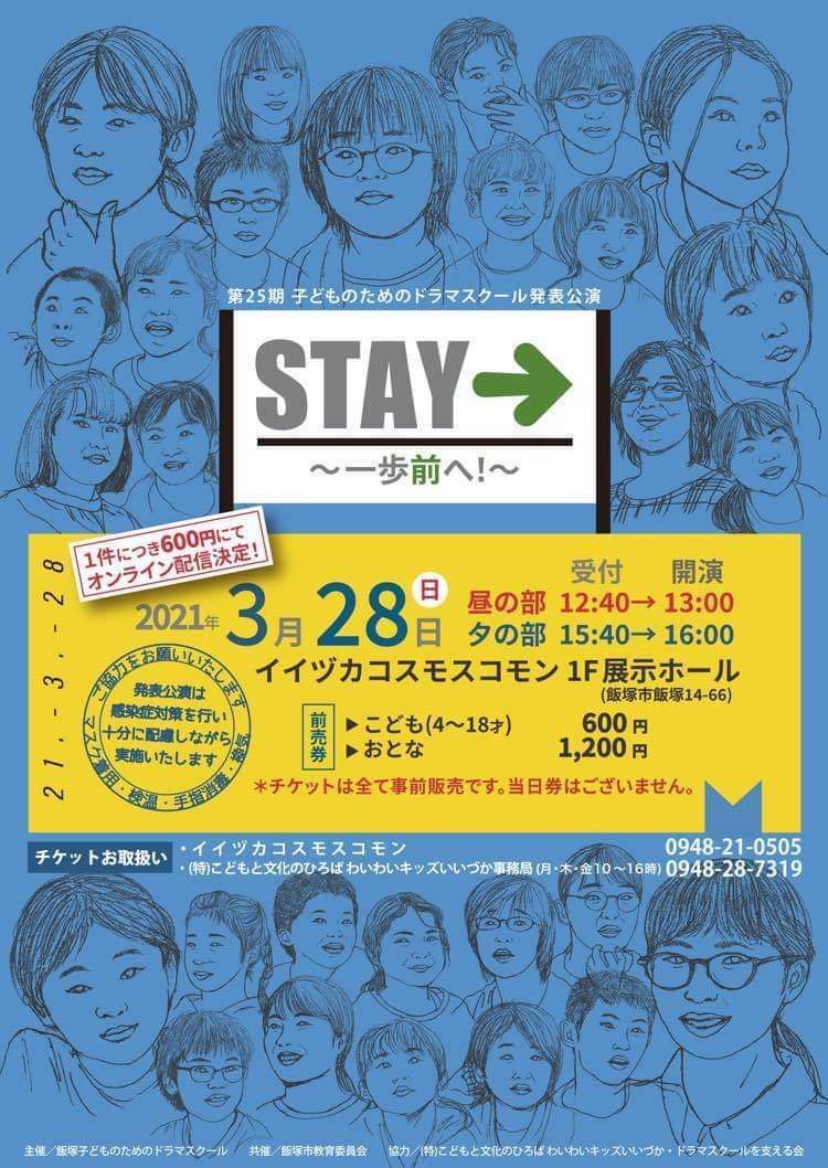 2021/02/08 21:19クラウドファンディングにご支援、ご協力頂きました。ありがとうございました。25期発表公演を開催することが出来ます。タイトルは「STAY→ ~一歩前へ!~」コロナ対策もあり、今回は10年ぶりのオムニバス形式でお届けします。タイトルからオムニバスのテーマ、物語の舞台設定も子どもたち自ら考え、演じながら創り直しながら随意創作しています。本番当日も、1ステージと2ステージの間にも創作していきます。会場には感染症対策として1ステージ100名のみご入場頂きます。しかし、子どもたちの舞台のライブ感を味わいたい!方に向けてオンライン配信(おうちでパブリックビューイング)を追加でご用意いたしました。尚、会館の通信環境含め、映像・音声のクオリティーの保障は申し訳ありませんが、ご勘弁いただくことになります。ぜひ、楽しんでいただければと思います。お申し込み・お問い合わせはiizukakodora@gmail.com飯塚子どものためのドラマスクール もっと見る
