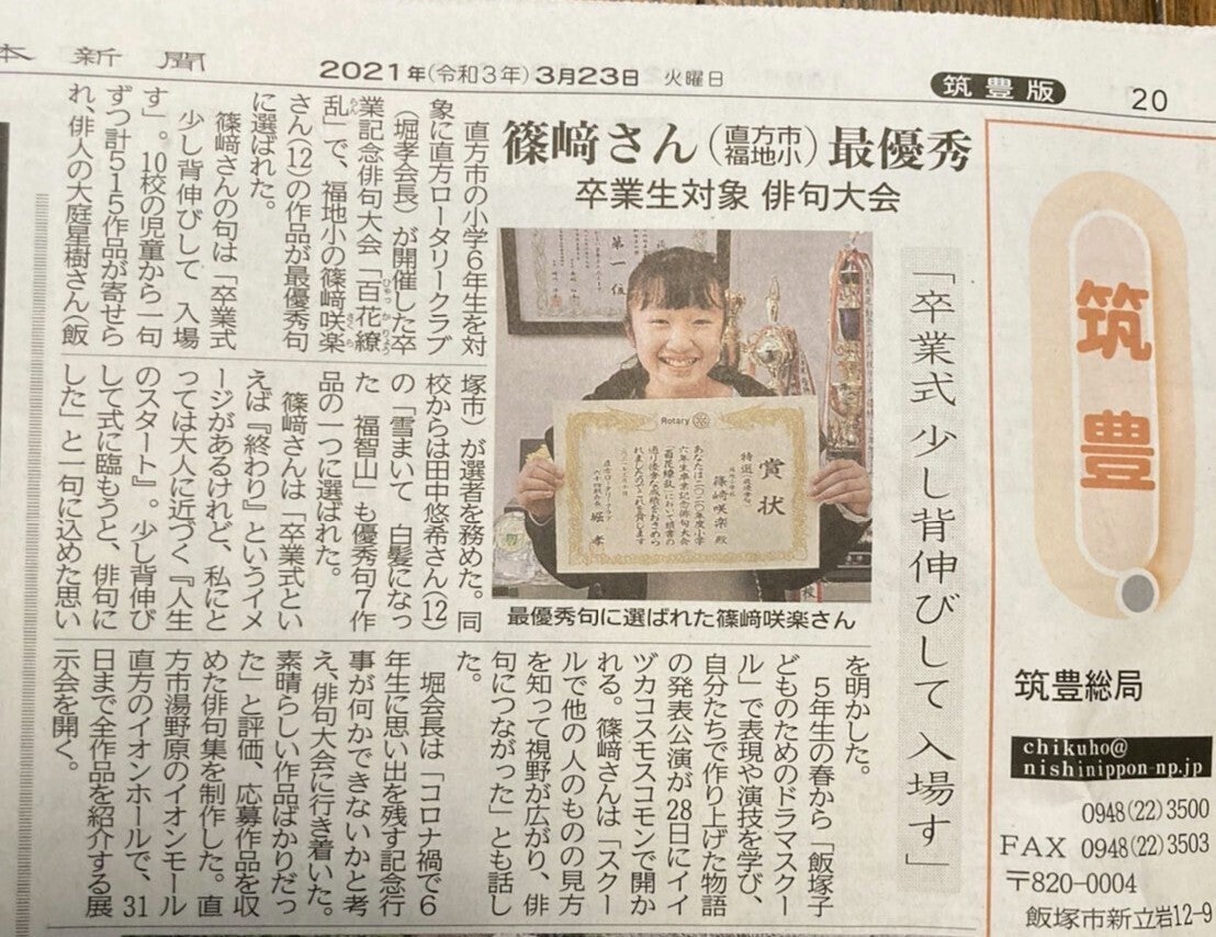 2021/03/23 22:52西日本新聞2021.3.23朝刊に、25期に参加中の篠崎咲楽さんの記事が掲載されました。卒業式を迎えた心情を詠んだ俳句が最優秀賞とのこと。俳句の事だけでなくドラマスクールについても語ってくれています。とても嬉しかったので皆さまにもお知らせさせて頂きました。 もっと見る