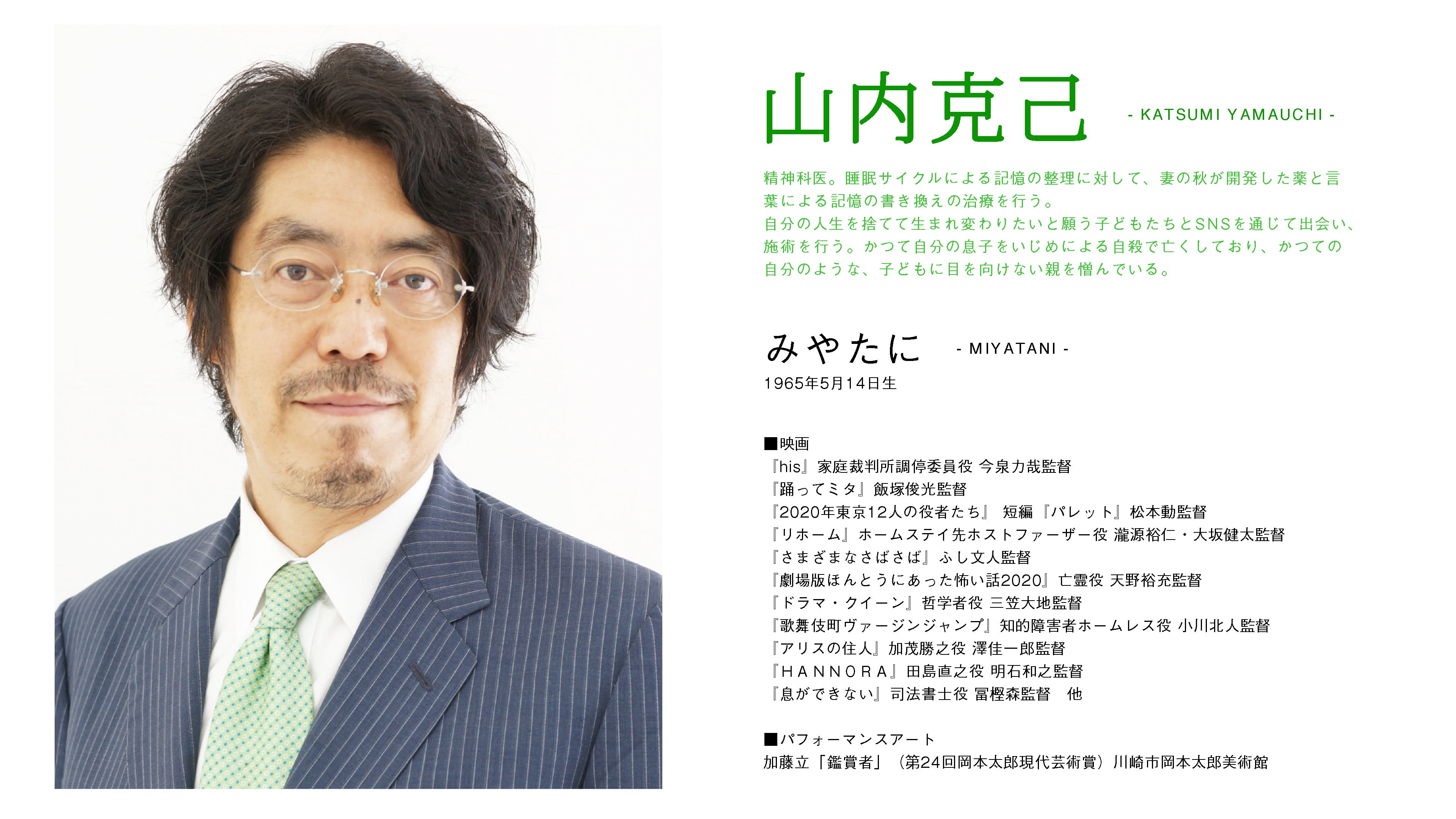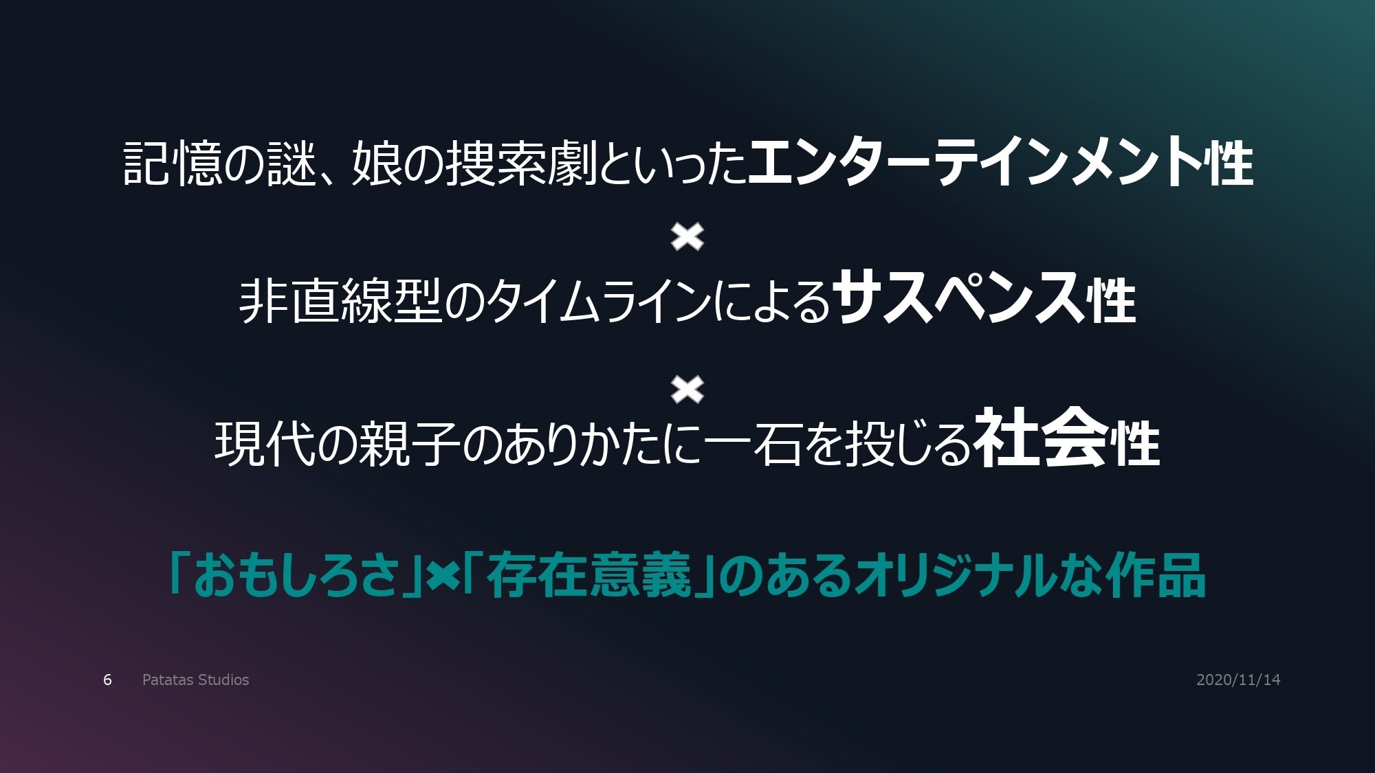 この映画の中で、先述しました、クライムフィクションや記憶の謎といったエンターテイメント性と私たちが問題意識を持っている親と子の関係性といった社会性が共存した内容を描きたいと考えております。