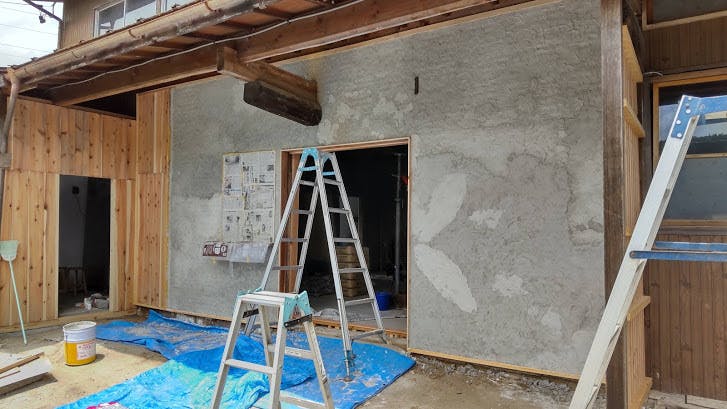 店舗内はあと天井の梁を磨いたり、壁に板を打ち付けたり、土壁に漆喰を塗ったりといった作業が残っています。