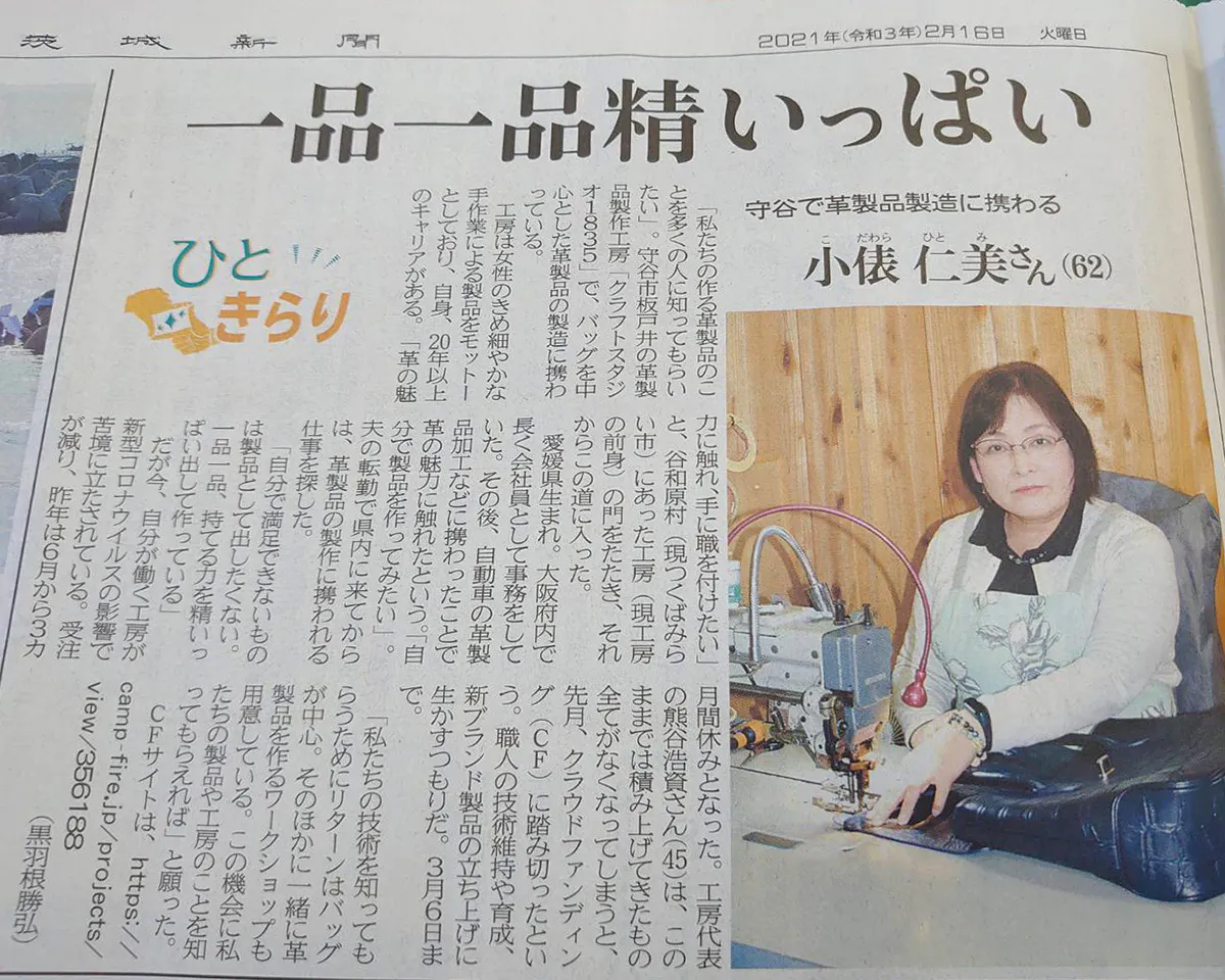 『craftstudio1835』の工場長『小俵 仁美』さんが、茨城新聞の紙面を飾りました‼