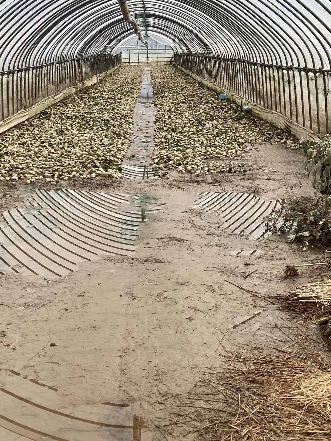 福岡県は葉物の生産量が全国で1位で日本全国へ出荷されています。しかし7月より降り続いた集中豪雨により農家さんの大切に育ててきた葉物農園が大きな被害にあってしまいました。ビニールハウスの中まで水が溜まり完全に7月〜8月分の収穫予定の作物は全滅してしまいました。