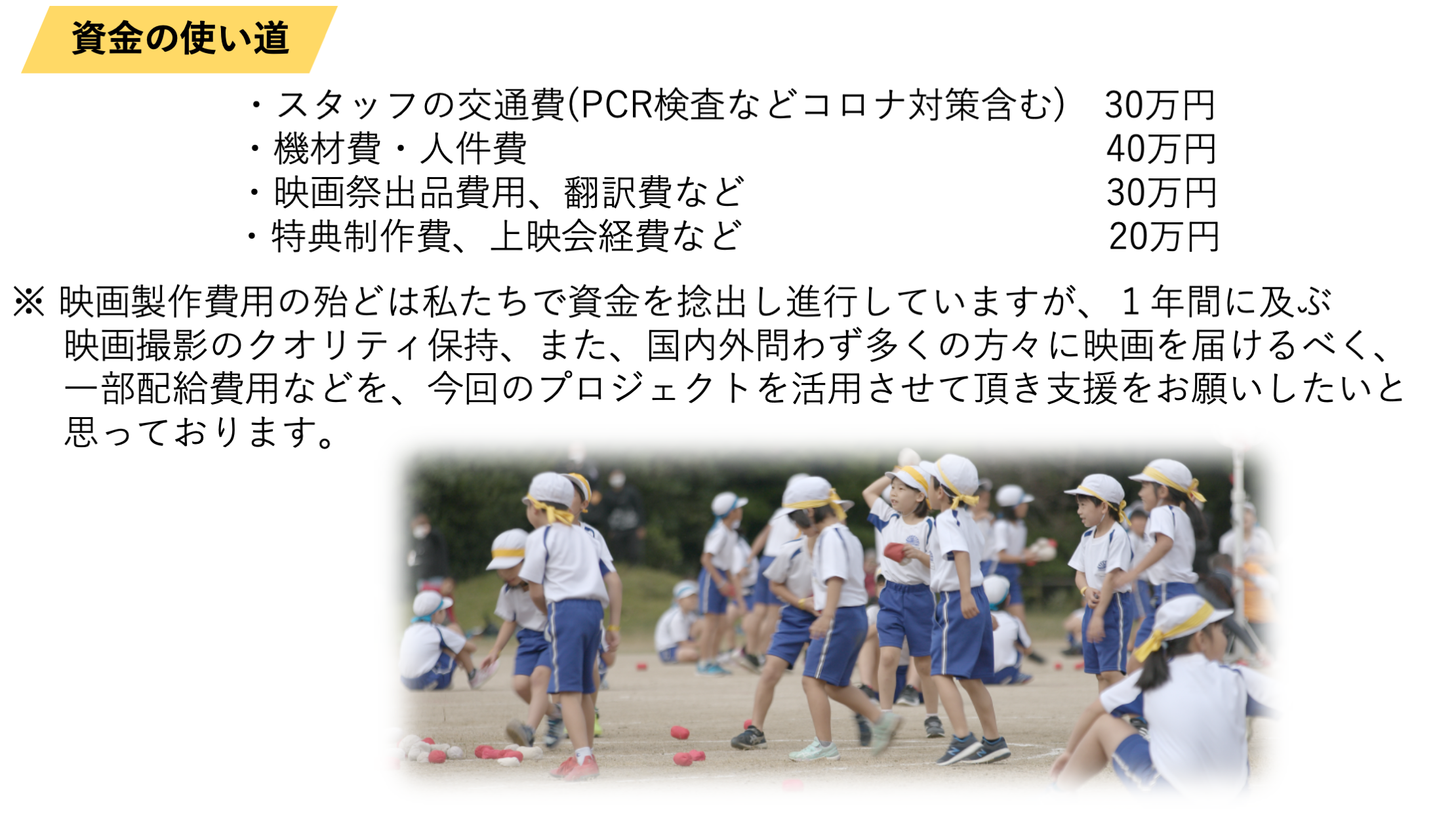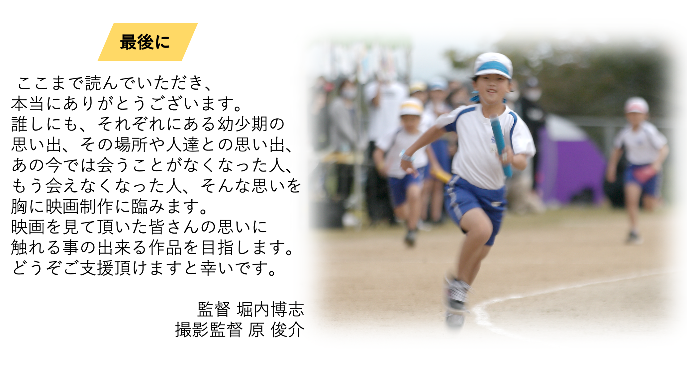 2023/01/25 11:22お世話になっております、映画「東小学校」映画制作プロジェクトの原です。ご報告が遅くなりましたが、昨年12月に映画が完成いたしました。約110分の、とても良い映画に仕上がっています。ご支援の皆様には大変お待ち頂き、感謝の気持ちでいっぱいです。春ごろには、支援者様に観て頂けるよう、上映会等を予定しておりますので、また連絡させて頂きます。今後は、国内外の映画祭への出品、夏に全国公開に向け、準備しております。引き続きご支援のほど、よろしくお願いいたします。 もっと見る