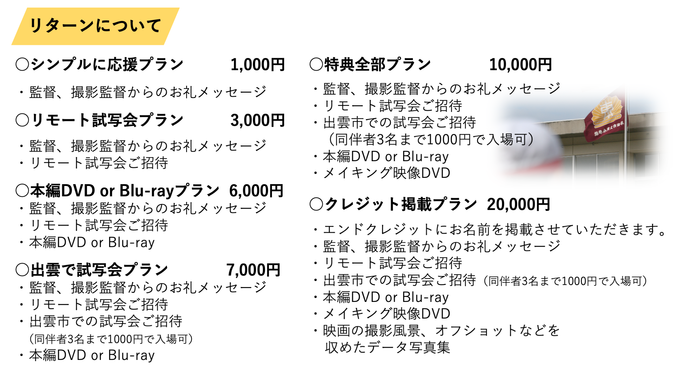 2024/06/27 01:39近況報告が遅くなってしまい申し訳ありません。現在、映画「東小学校」を国内外の映画祭に出品し、順次報告を待ちながら、広島、福山での上映、返礼品のDVD等の製作を進めております、返礼品をお待ちのみなさま遅くなってしまい申し訳ありません、もうしばらくお待ちください。上映会6月29日、広島会場、30日福山会場、それぞれ1日限りの上映になります。今後、全国各地の映画館での上映を目指し、交渉をしております。上映会等の詳細は映画「東小学校」のHPでご確認頂きますよう、よろしくお願いいたします。映画「東小学校」HP映画祭につきましては、出品しておりました、「19th JAPAN FILM FESTIVAL LOS ANGELES 2024 」にて、長編部門で入賞いたしました。9月の映画祭にてこの中から各賞が決定いたします。そのほか、映画祭の朗報が届きましたら、順次お知らせいたします。引き続きよろしくお願いいたします。 もっと見る出雲市での先行試写会の開催につきまして