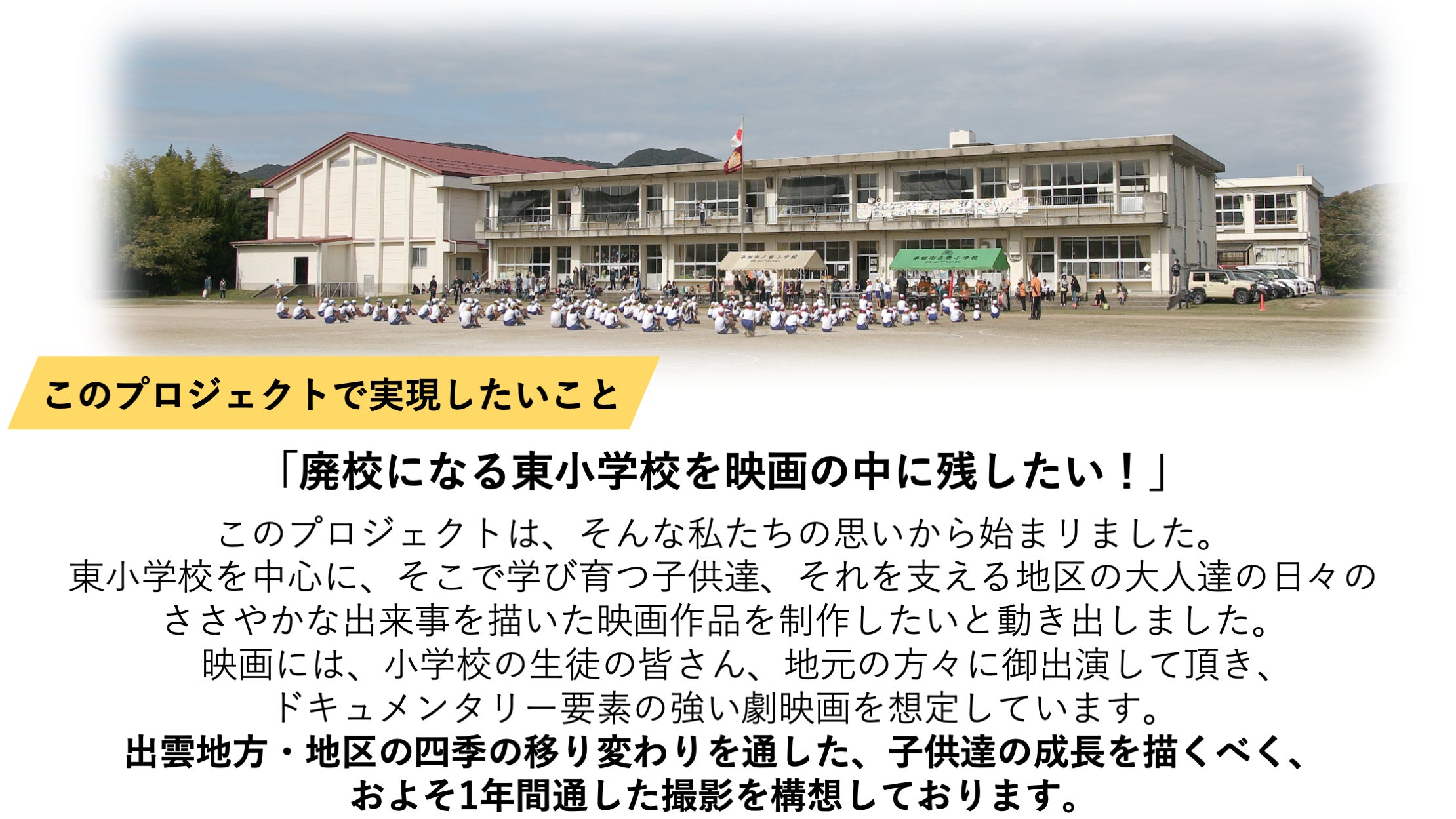 2024/06/27 01:39近況報告が遅くなってしまい申し訳ありません。現在、映画「東小学校」を国内外の映画祭に出品し、順次報告を待ちながら、広島、福山での上映、返礼品のDVD等の製作を進めております、返礼品をお待ちのみなさま遅くなってしまい申し訳ありません、もうしばらくお待ちください。上映会6月29日、広島会場、30日福山会場、それぞれ1日限りの上映になります。今後、全国各地の映画館での上映を目指し、交渉をしております。上映会等の詳細は映画「東小学校」のHPでご確認頂きますよう、よろしくお願いいたします。映画「東小学校」HP映画祭につきましては、出品しておりました、「19th JAPAN FILM FESTIVAL LOS ANGELES 2024 」にて、長編部門で入賞いたしました。9月の映画祭にてこの中から各賞が決定いたします。そのほか、映画祭の朗報が届きましたら、順次お知らせいたします。引き続きよろしくお願いいたします。 もっと見る出雲市での先行試写会の開催につきまして