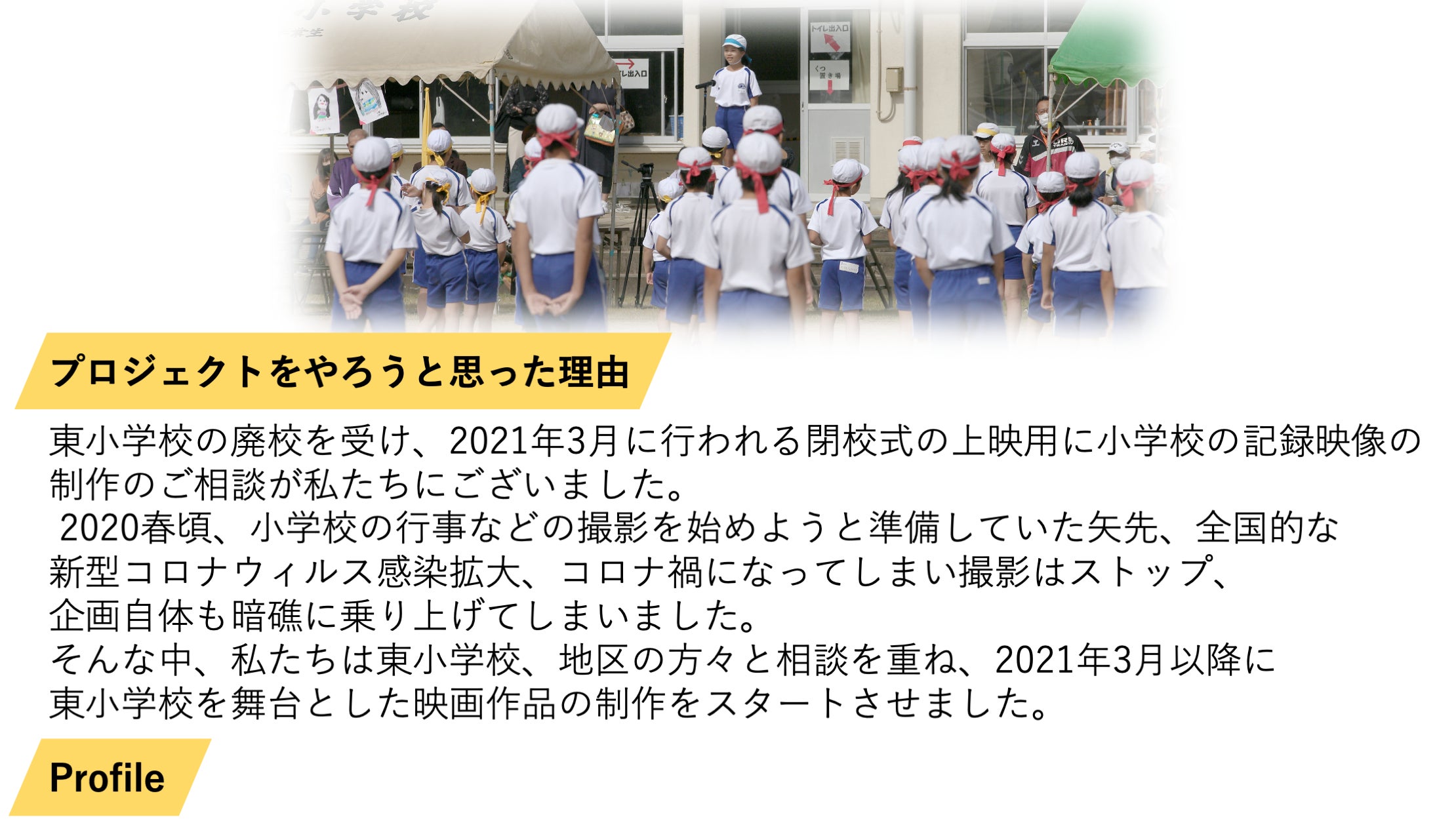 2023/01/25 11:22お世話になっております、映画「東小学校」映画制作プロジェクトの原です。ご報告が遅くなりましたが、昨年12月に映画が完成いたしました。約110分の、とても良い映画に仕上がっています。ご支援の皆様には大変お待ち頂き、感謝の気持ちでいっぱいです。春ごろには、支援者様に観て頂けるよう、上映会等を予定しておりますので、また連絡させて頂きます。今後は、国内外の映画祭への出品、夏に全国公開に向け、準備しております。引き続きご支援のほど、よろしくお願いいたします。 もっと見る
