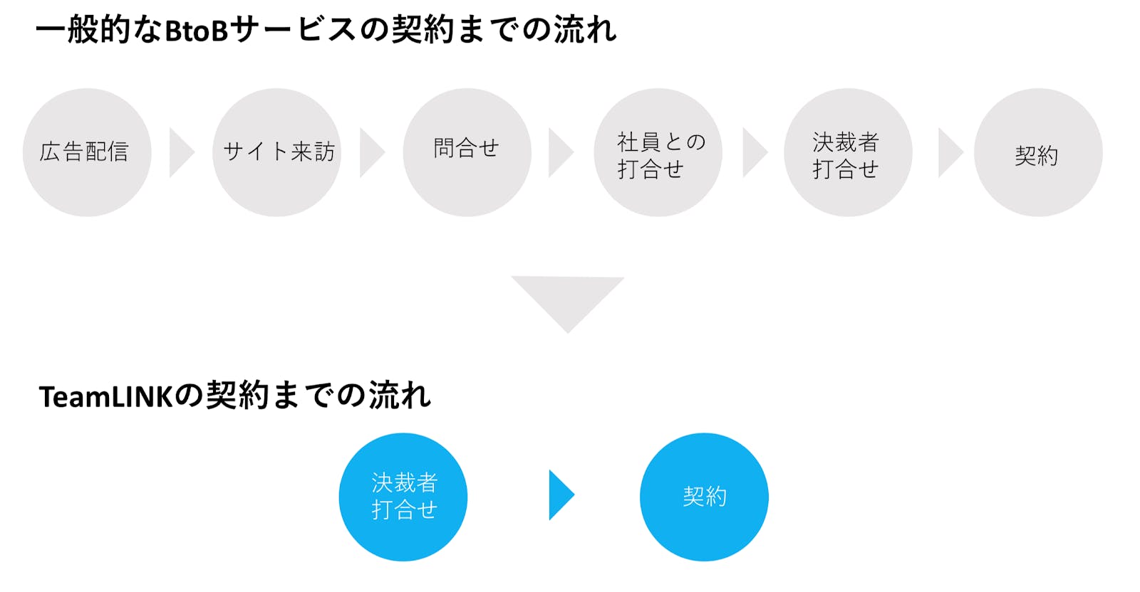 TeamLINKでは、上図のようにして契約までの流れを簡略化します。決裁権のある決裁者同士をマッチンングさせることで無駄な時間とコストを省くことを可能にしました。