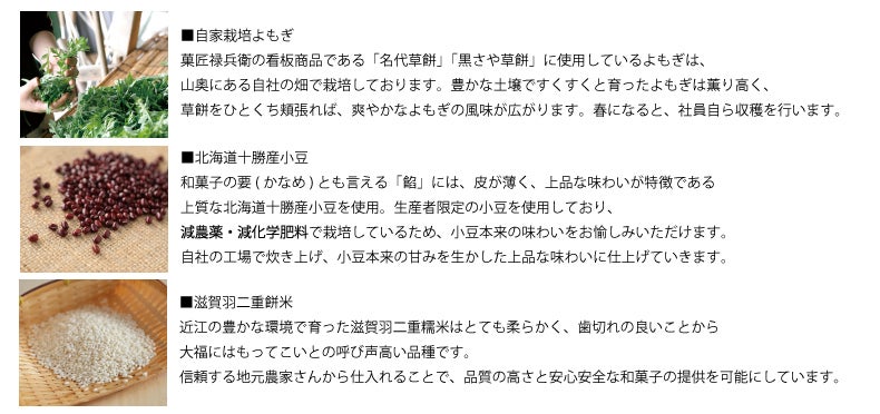 地元の素材や安心安全な素材にこだわった商品は地元のお客様には定番の和菓子としてお手土産やご自宅用のお茶菓子としてご利用いただき、「禄兵衛の草餅が一番美味しい」