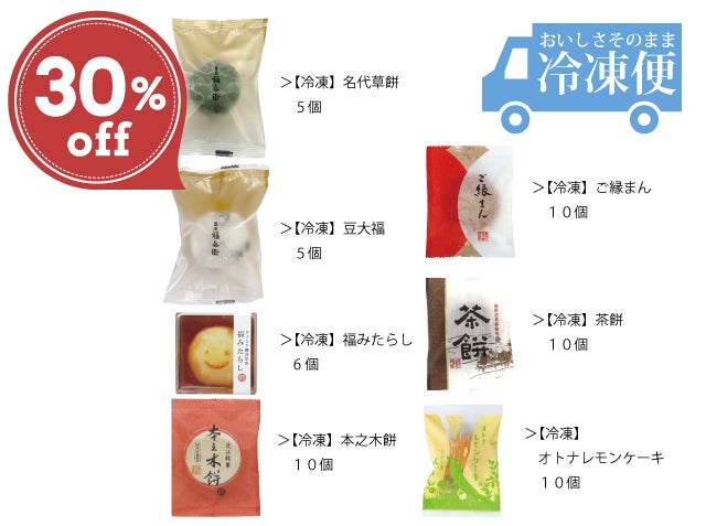 内容量:名代草餅5個、豆大福5個、福みたらし6個、本之木餅10個、ご縁まん10個、茶餅10個、