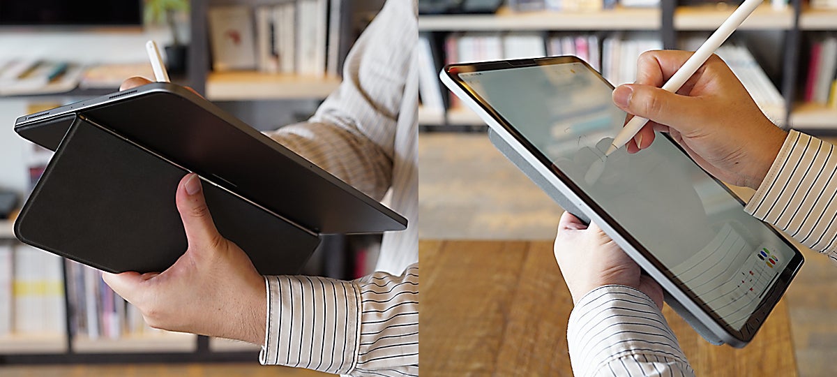 スタンド部が持ち手になるので、スタンディング利用でもiPadを安定して保持することができます。