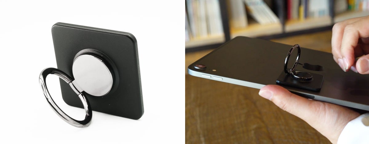 付属するスマホリングも共通のマウントで使えるので、スタンドを取り外してスマホリングに変えることで、iPadをよりグリップしやすくできます。もちろん何度でも好きなだけ、つけ外し自由!