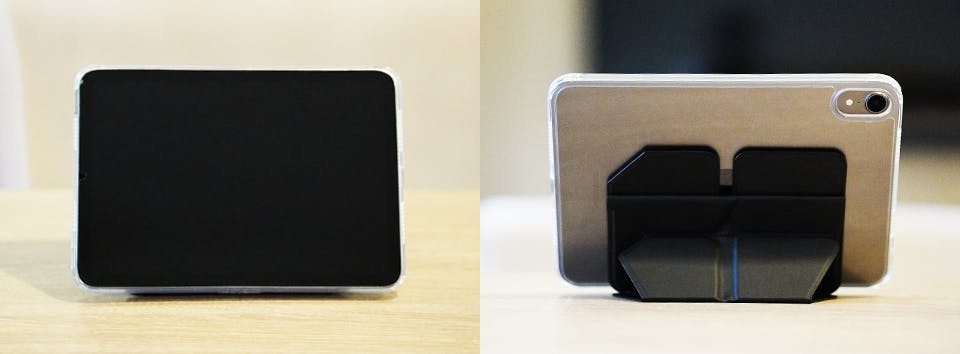 本製品を見開いて展開することで、スタンドとしての接地面積がなんと通常品と比べて2倍になり、安定したスタンドとして利用することができます。これはiPad等のタブレットスタンドに最適です。