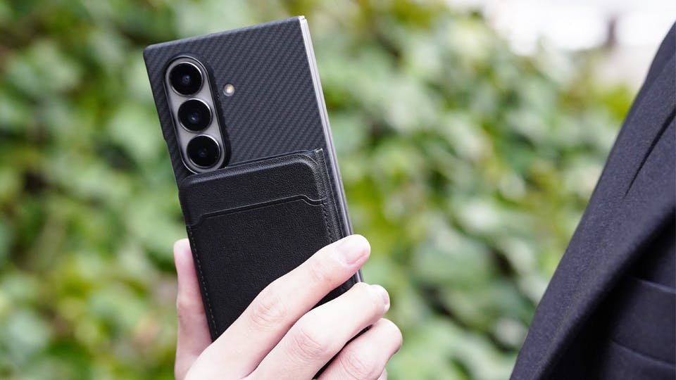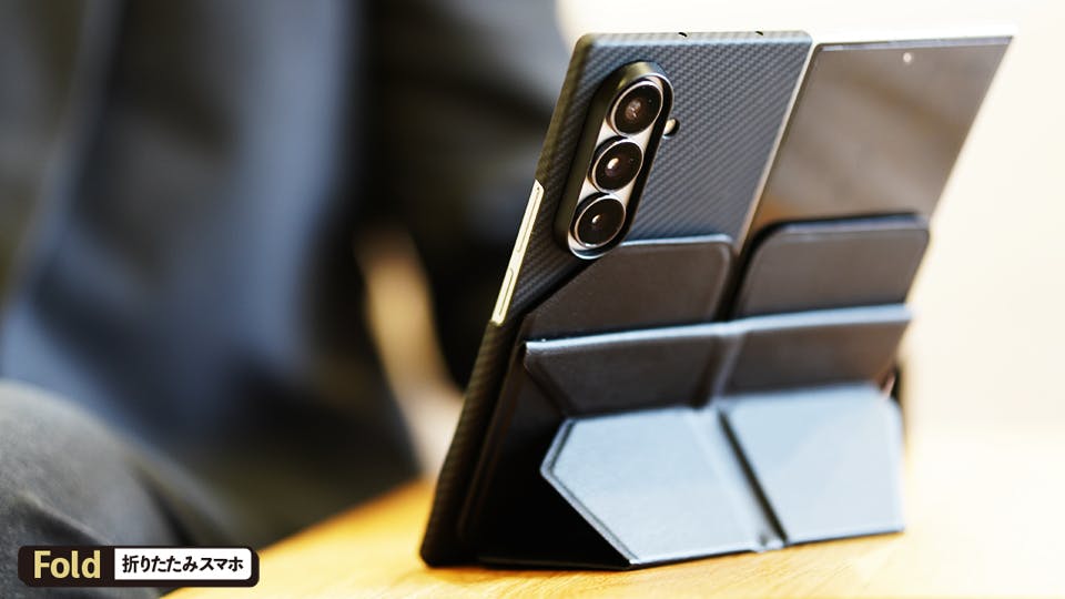 折りたたみスマホにジャストフィットする、両手ホールドとして使えて、