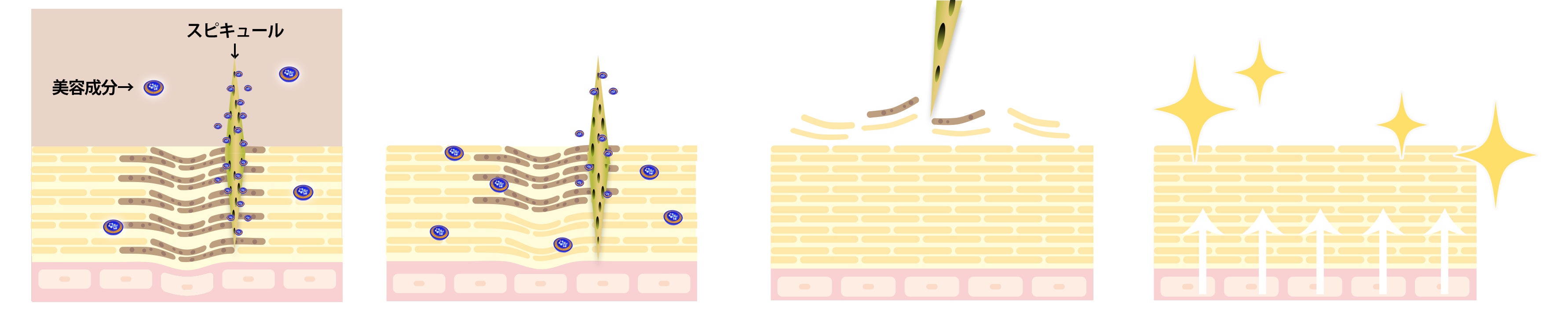肌に刺さっている間中、スピキュールに浸透している有効成分が、継続的に肌へ浸透していきます。また、肌に刺さったスピキュールは、約72時間で古い角質と共に抜け落ち排出されるので、安心してお使いいただけます。