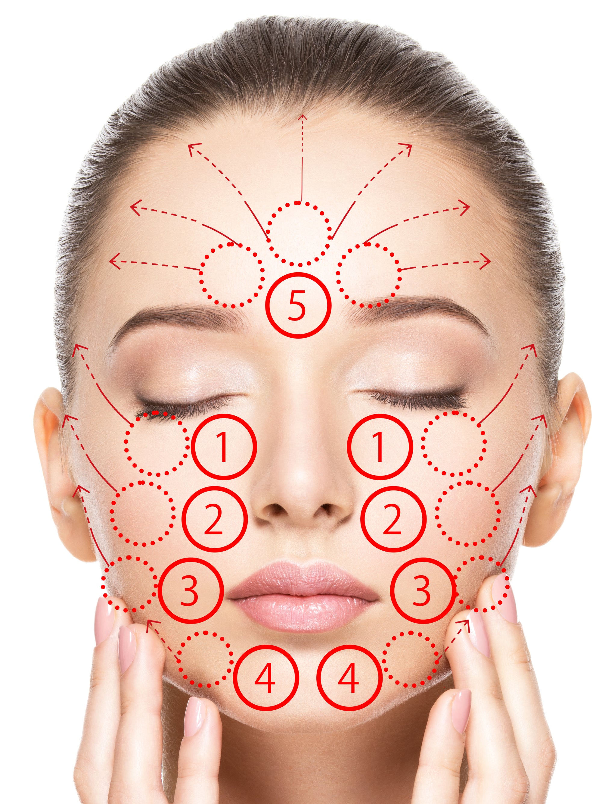 ⑤眉間~額の生え際に向かい、放射線状にスポンジを動かし、それぞれ生え際に到達したら、軽く上昇させるように引っ張り上げます。