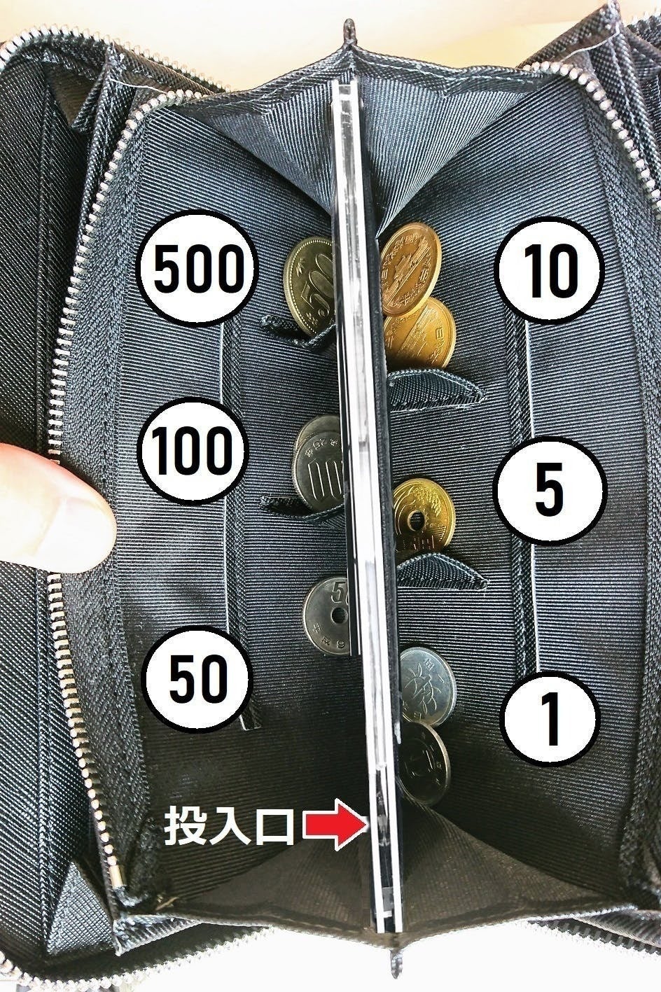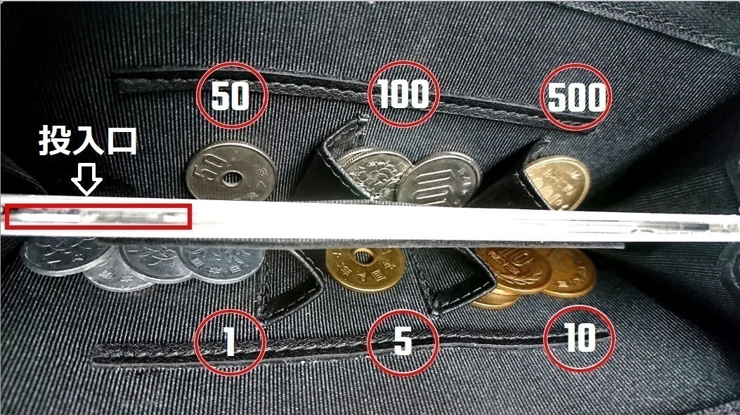 ※入れたコインは転がってそれぞれポケットに落ちますが、財布の角度が垂直など右方向斜めになっていない場合は違うポケットに落ちますのでご注意ください。