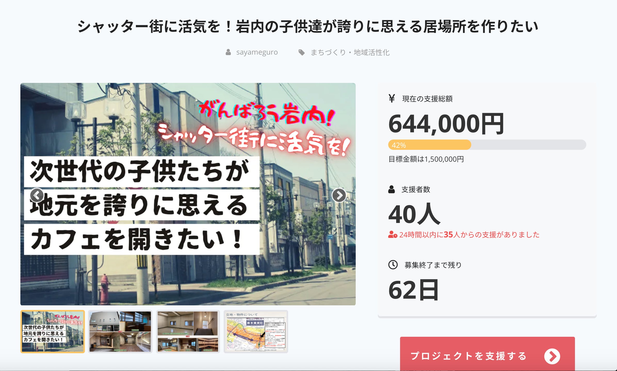 そしてなんと、現在はその方々のおかげでスタート24時間にして、42パーセントの達成率で644,000円を40名の方々にご支援頂きました。