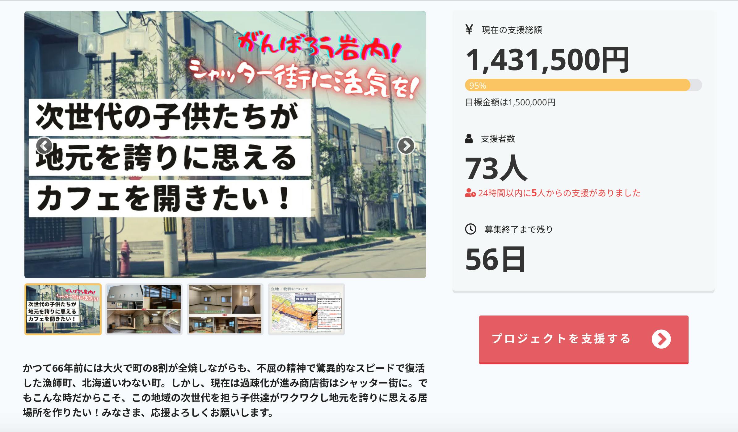 本日開始一週間目にして・・・達成率95%、支援総額はなんと1,431,500円!