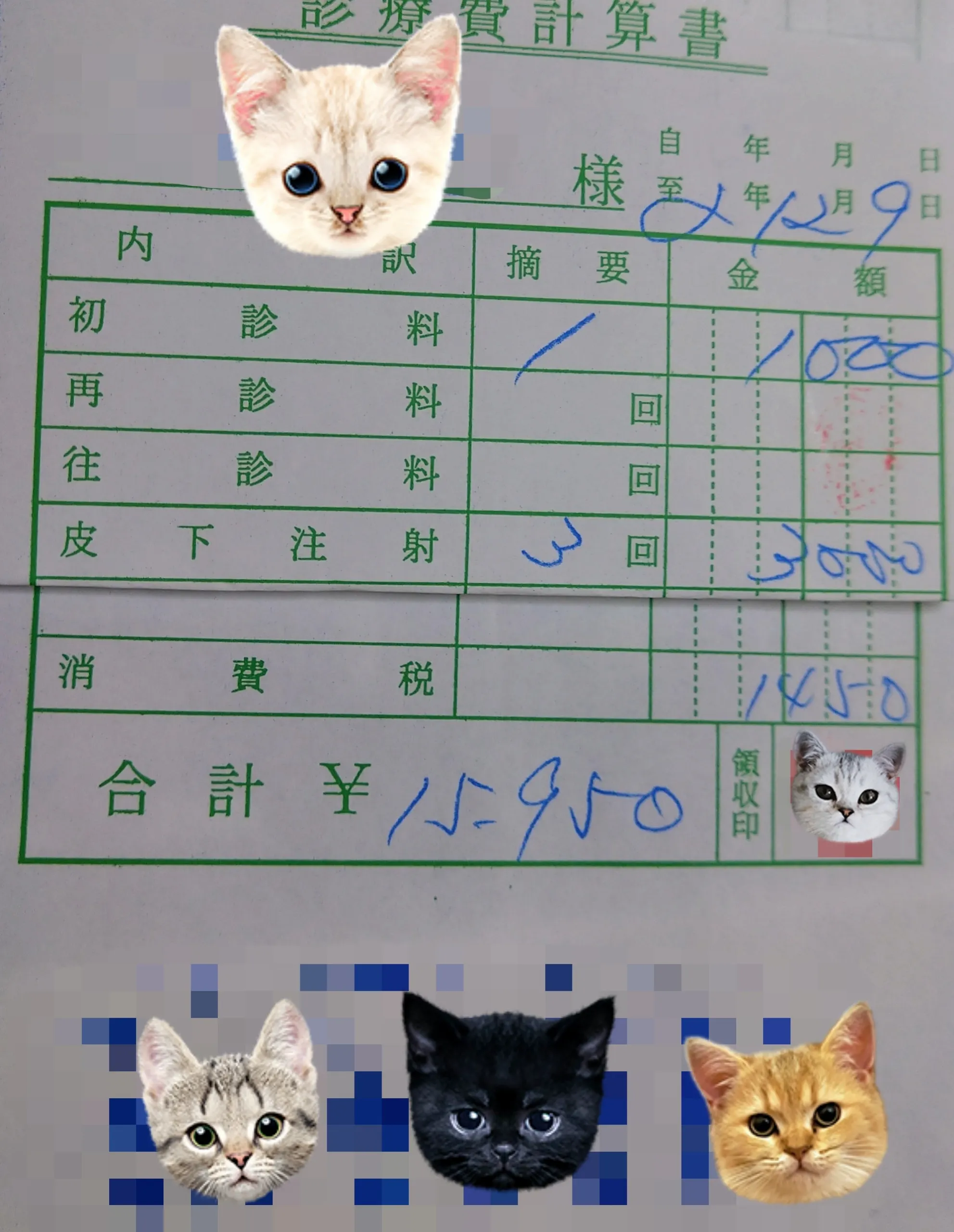 風邪っぽかった野良猫ちゃんが心配なので病院へ連れていきました。検査してもらった結果、39.5度の熱があり、そのせいで食欲がなかったようでした。4日程食べているところを見れてなかったのですが、薬を注射して貰ったら少し元気になったようで、その日からは食欲も徐々に回復してます。(病院代6000円程(1万はペットワクチン分です)