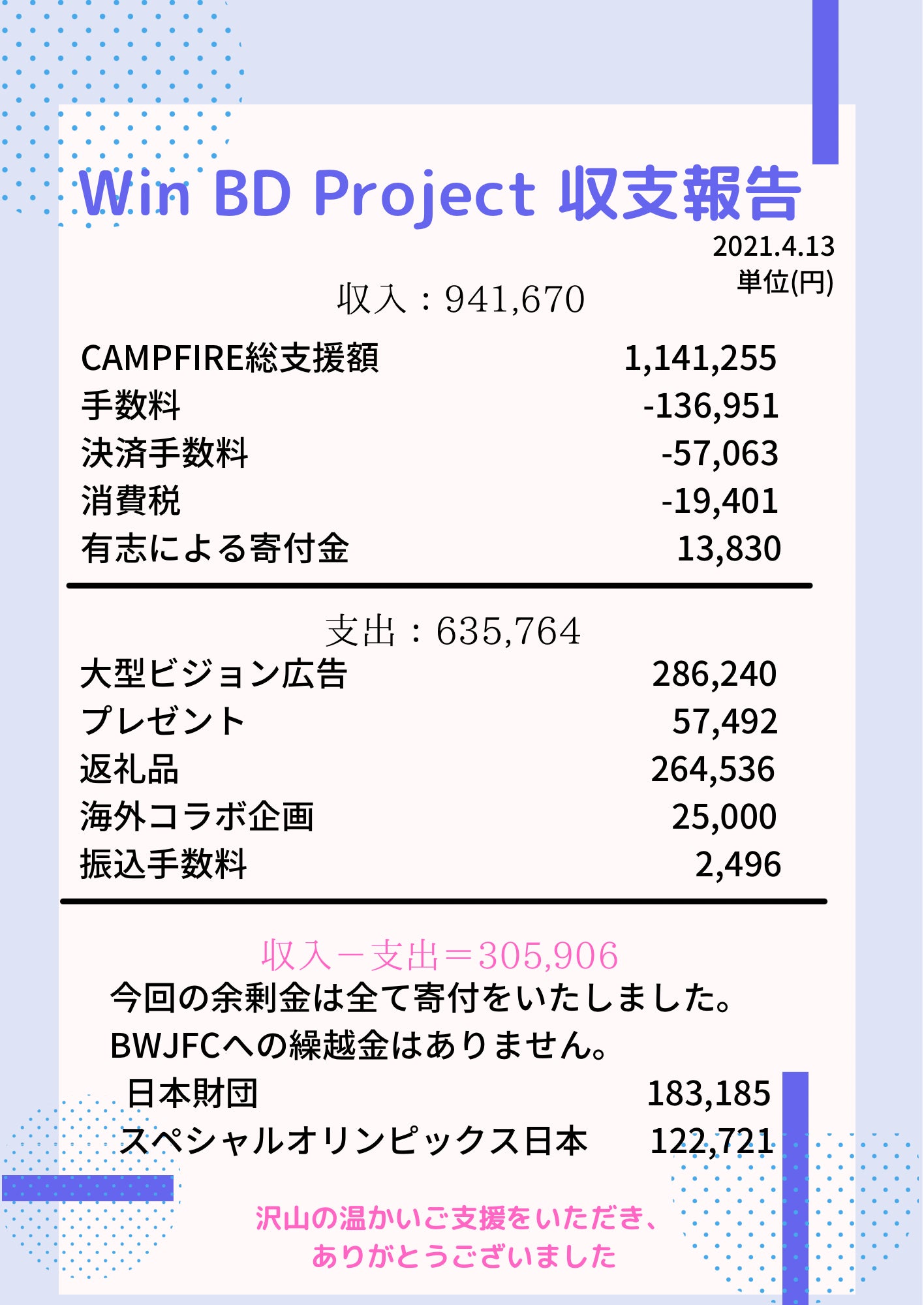 2021/04/13 21:072020年12月21日より沢山の皆様にご支援をいただきましたWin 22歳おめでとうプロジェクトも、最後のご報告です。おかげさまで、無事にプロジェクトを実行することができました。コロナ禍の中で大型ビジョン放映が行えたのも、皆様からご賛同やご協力をいただいたからだと思っております。ご支援くださった皆様、本当にありがとうございました。標記の通り、プロジェクトの収支報告をいたします。ご不明な点がございましたら、CAMPFIREのメッセージ、またはbrightwinjfc.shien@gmail.comまでお気軽にお問い合わせください。今後も、BrightWinのためにどんなことができるのか考えながらBrightWinJFCは活動を続けて参ります!これからも一緒に2人を応援していきましょう!!【お知らせ】先日もお伝えしています通り、デジタル返礼品のダウンロード期限は4月30日(金)24時までです。ご確認ください。 もっと見る返礼品を発送いたしました