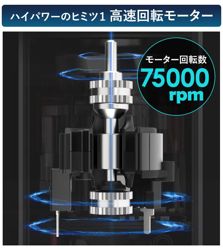「AutoBot VX」のハイパワーのヒミツは、75000rpm(1分間に75000回転)の高速回転モーターにあります。回転モーターが生み出す高速サイクロン気流が、目に見えない小さな汚れまでしっかり吸引。