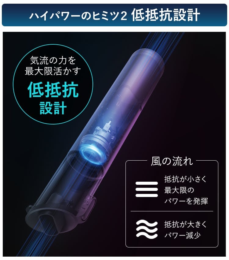 さらに、生み出された気流のパワーを最大限活かす低抵抗設計もポイントです。ゴミと共に吸い込まれた風が円筒内部を通って、背面から真っすぐ抜けていく無駄のないデザインで、効率の良い吸引を持続することが可能です。