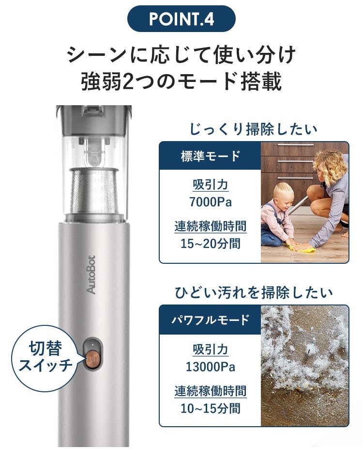 例えば少し長い時間掃除をしたい場合は、消費電力を抑えた標準モードで。汚れのひどい場所のお掃除にはパワフルモードで。ワンタッチで簡単に切り替えられます。もちろん、標準モードでも、一般的なコンパクトハンディクリーナーや、「AutoBot」旧モデルよりも強い吸引力を実感頂けるはずです。