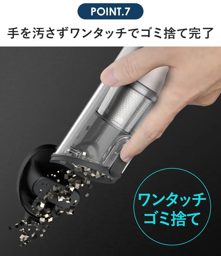 スリムで、収納スペースをとらないので、置き場所は自由。気付いたときに、さっと手に取って使えます。また、吸引力13000Paのハイパワーで、あらゆるゴミや汚れを確実に吸引。お掃除の効率が格段にアップします。