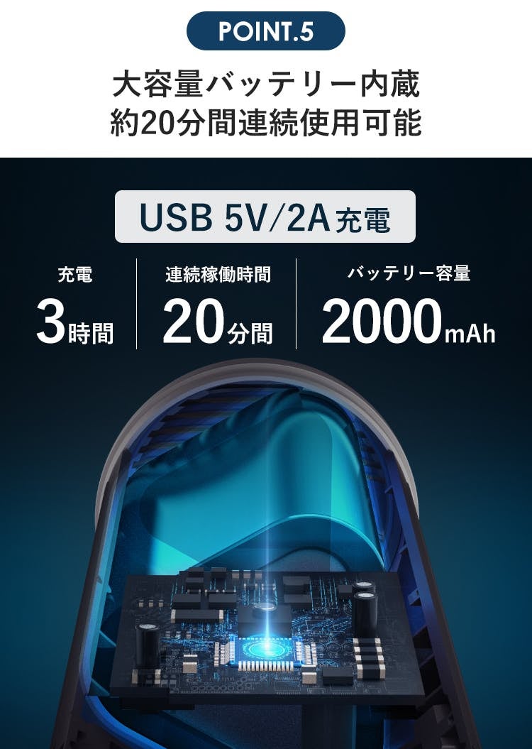 「AutoBot XV」には、2000mAhの大容量バッテリーを内蔵しています。急速充電技術により約3時間でフル充電が完了。便利なUSB充電タイプなので、旅行や出張先でも活躍してくれますよ。