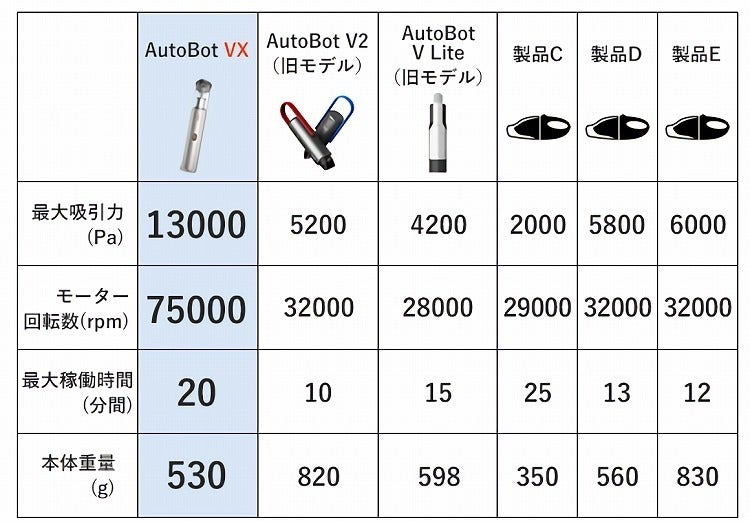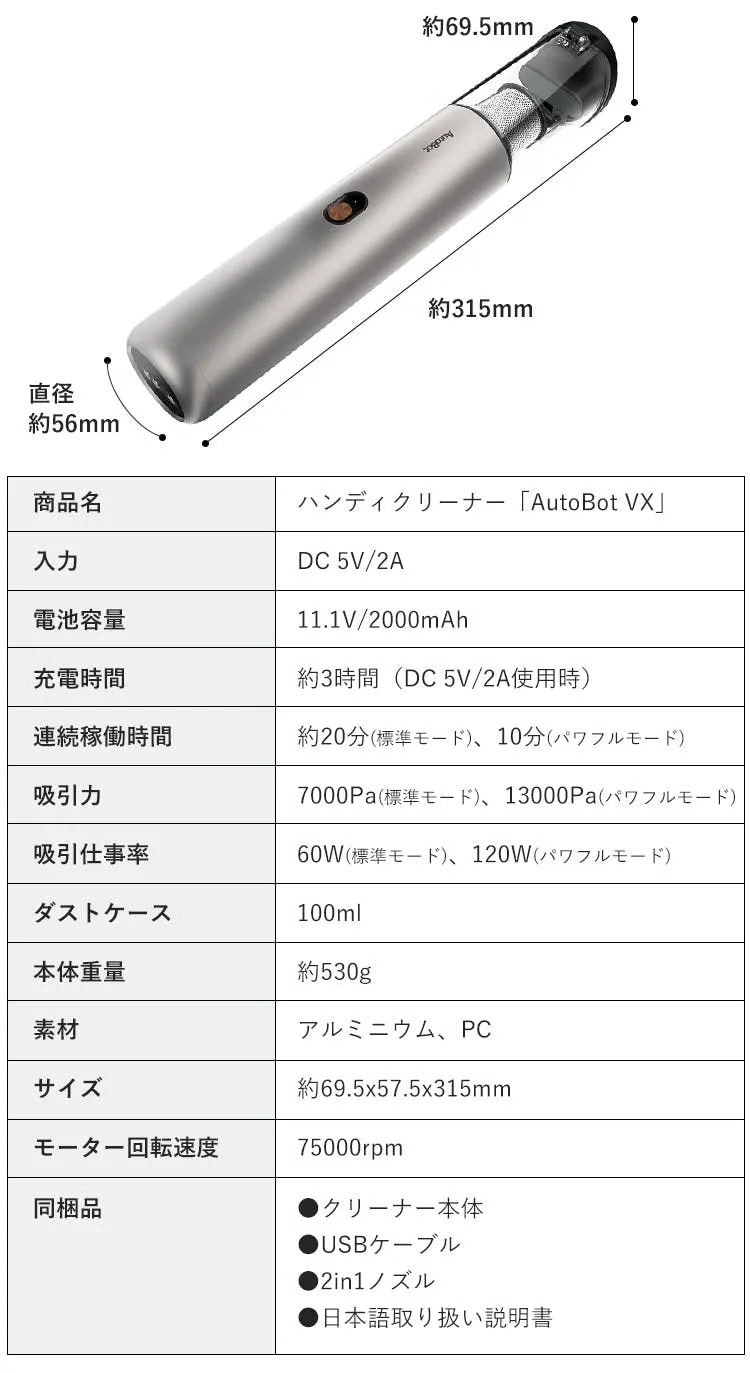 小型ハンディクリーナー最強クラスの吸引力13000Paを誇る「AutoBot VX」