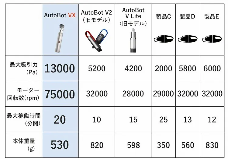 市販のコンパクトタイプのハンディクリーナーを調査したところ、吸引力2000~6000Pa程度の製品が多く見られました。もちろん、この程度でもゴミを吸い取ることは可能です。でも、隙間に入り込んだ細かな屑や、カーペットの毛髪までしっかり吸い取りたいなら、断然「AutoBot VX」がオススメ。