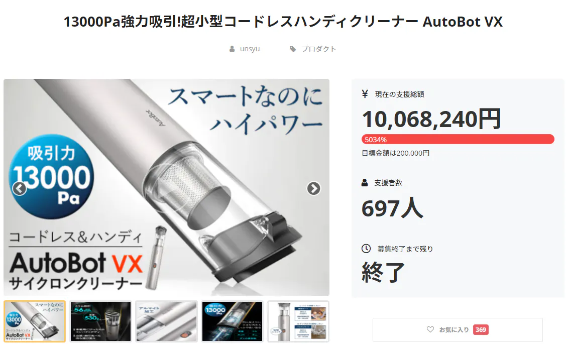 第1弾では1000万円以上の資金調達に成功した「ハンディクリーナーAutoBotVX」。目標を大きく上回る結果となり、ご支援いただいた皆様に心より感謝申し上げます。