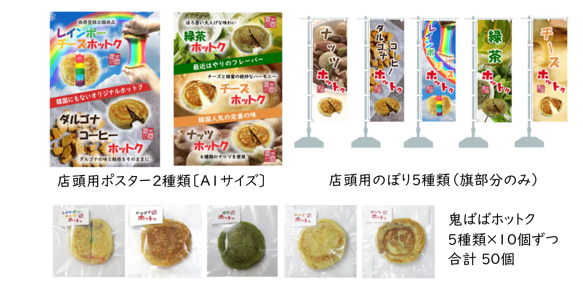 「レインボーチーズホットク」をはじめとする当店ホットク5種類を日本全国の人に知ってもらうための販促活動に使わせて頂きます。