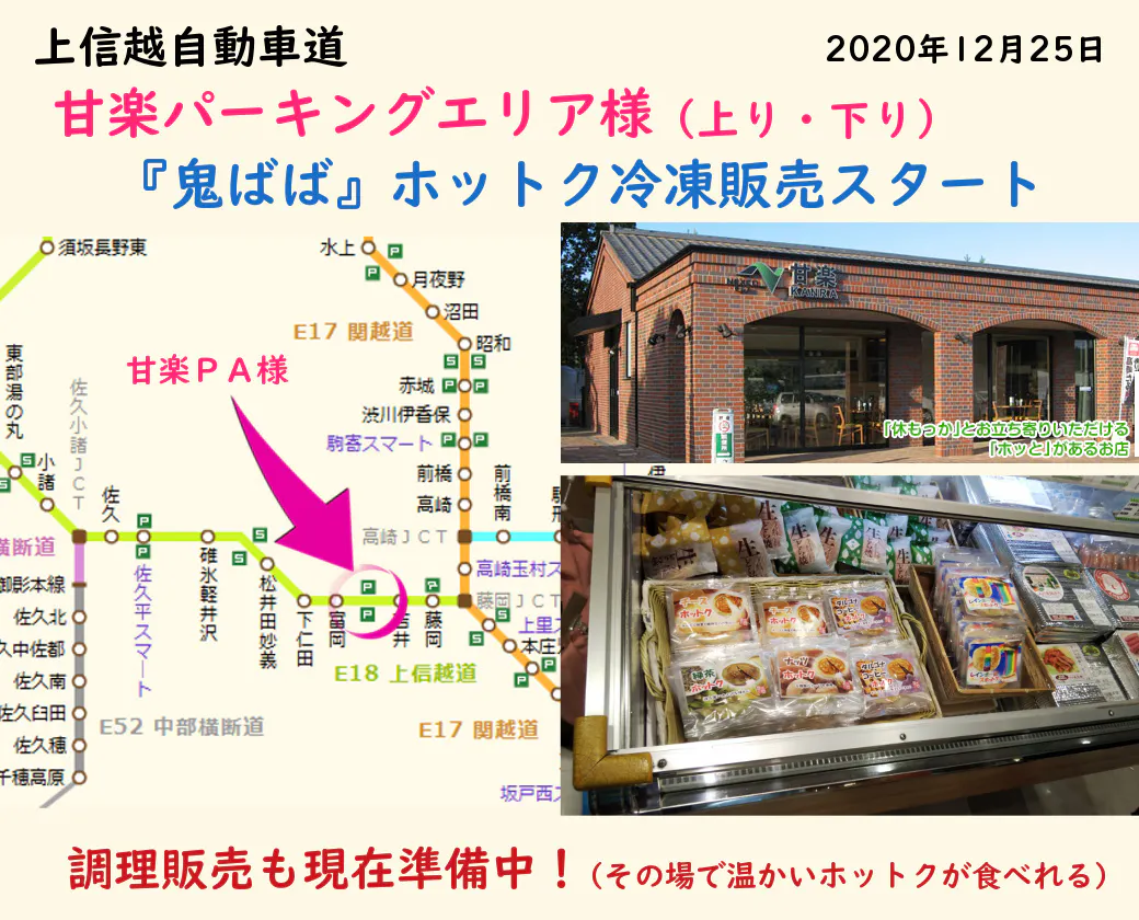 2020/12/26 16:46上信越自動車道 甘楽パーキングエリアで、当店ホットクを販売して頂ける事になりました。今は冷凍販売のみですが、調理販売(温かいホットクをその場で提供)も準備中。上信越自動車道をご利用の際は、是非「甘楽パーキングエリア」にお立ち寄りください。※ 甘楽パーキングエリア スタッフ様販売準備等 ありがとうございました。これからもよろしくお願い申し上げます。 もっと見る