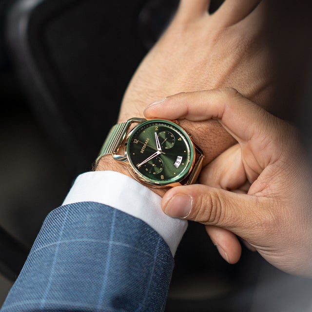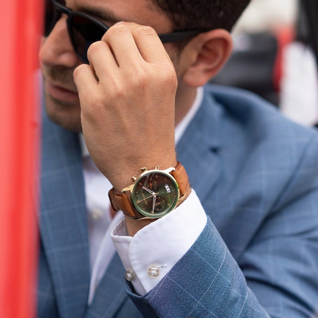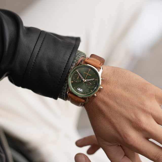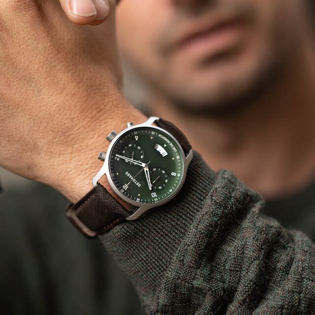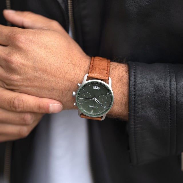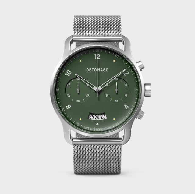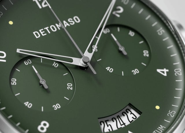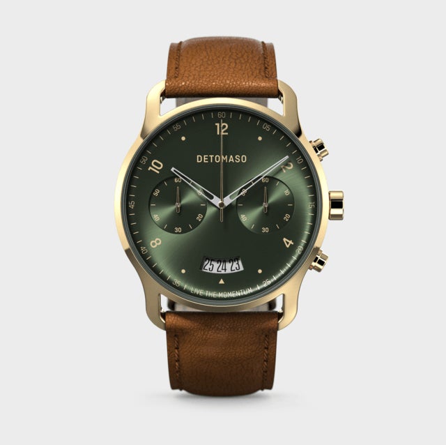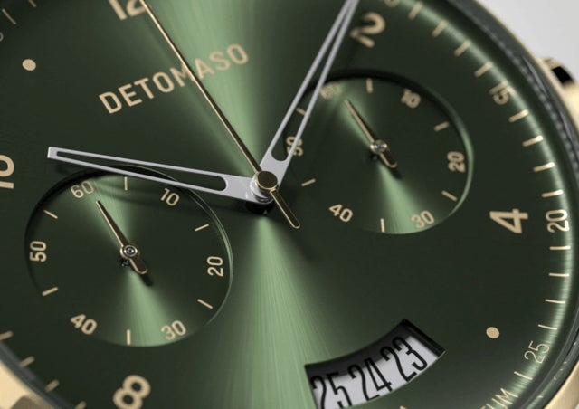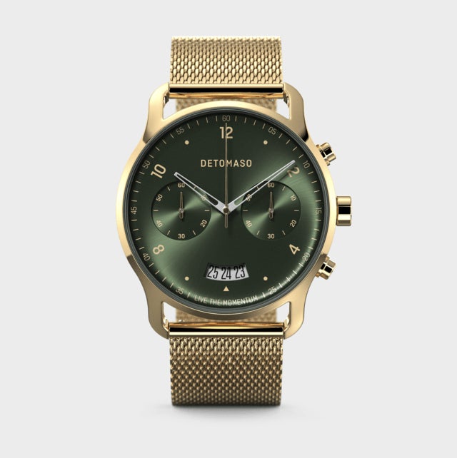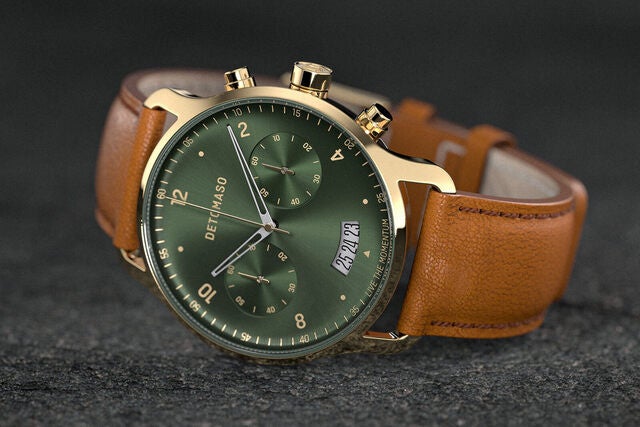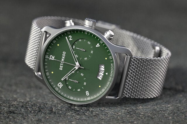 ゴールドと光沢深緑の文字盤はDETOMASOならではの新しい挑戦。DETOMASOは常に進化し続けます。