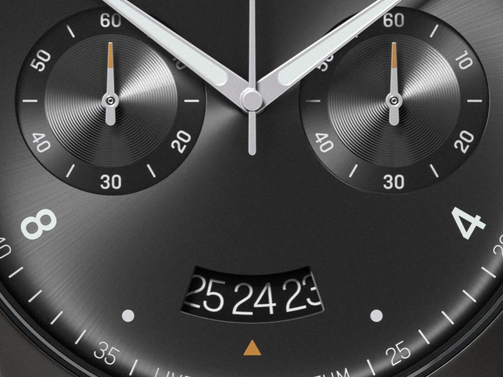 オーソドックスなブラック文字盤にホワイトのインデックス、抜きによるシンプルなマットシルバー針にオレンジのアクセント。