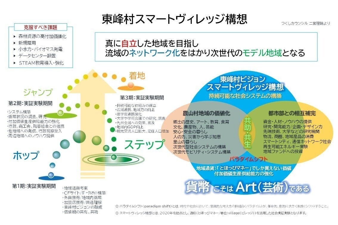 そこで、東峰地域通貨「とほっぴビレッジマネー/単位:village(ビレッジ)」を試験運用し、地域内を通貨が循環することで「新たな村の付加価値」を生み出す取り組みを行います。