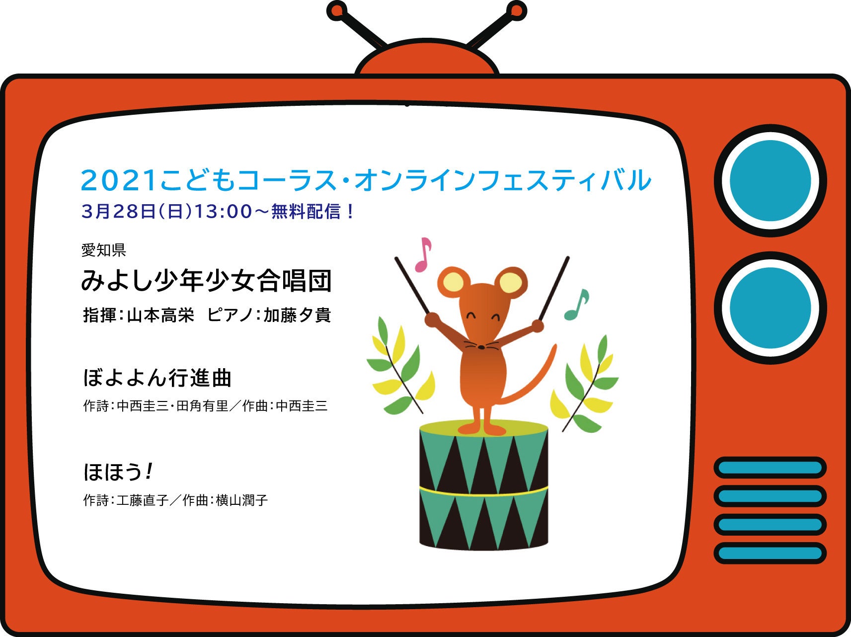 オンラインフェスティバルでは、おかあさんといっしょの「ぼよよん行進曲」、横山潤子さんの「ほほう!」を披露してくださいます。どうぞお楽しみに!