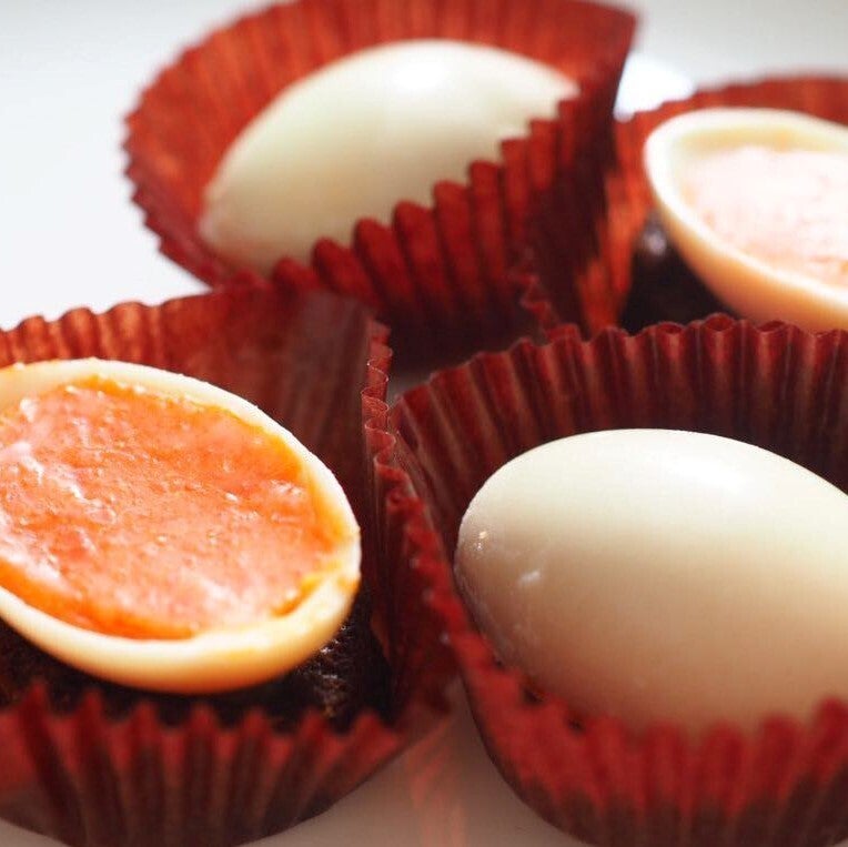 卵黄を焼いてしまうのではなく生卵のままチョコレートに混ぜ込みました。