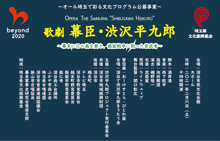 2021/03/17 11:41【2021年3月17日:お礼・公演終了のご報告】皆さまにご支援いただきました【歌劇 幕臣・渋沢平九郎】公演は深谷市民文化会館・大ホール(2021年2月6日)、録画配信(2021年2月9日~15日)の全日程で無事終了いたしました!緊急事態宣言下での公演となりましたが、深谷市さまをはじめ沢山の皆さまのご支援、ご協力により滞りなく公演を開催し、幕を下すことができました。公演前と公演終了時にはテレビのニュースで取り上げられ、また新聞にもご掲載いただけたりと、お陰様で大変注目されるイベントとなりました。高崎城乗っ取り計画壇上左から:尾高長七郎、渋沢栄一、尾高惇忠、渋沢成一郎、渋沢平九郎ストーリー進行に重要な役割を務める助左と五兵衛の掛け合い飯能戦争のシーン照明効果でも場を盛り上げました戦いに敗れ、敗軍のアリアを歌う渋沢平九郎時代考証を経て幕末の衣装や小物を再現飯能まで来たが平九郎に会えず、恋慕のアリアを歌うおゆき自刃岩の傍らで撃たれた平九郎をなすすべもなく見つめるおゆきと助左フィナーレコロナ禍での開催という非常に厳しい条件の中、できる限りの力を尽くして公演をやり遂げることができました。沢山のご支援を賜り誠にありがとうございました。心より感謝申し上げます。渋沢平九郎プロジェクト もっと見る【2021年1月18日:途中経過のご報告】