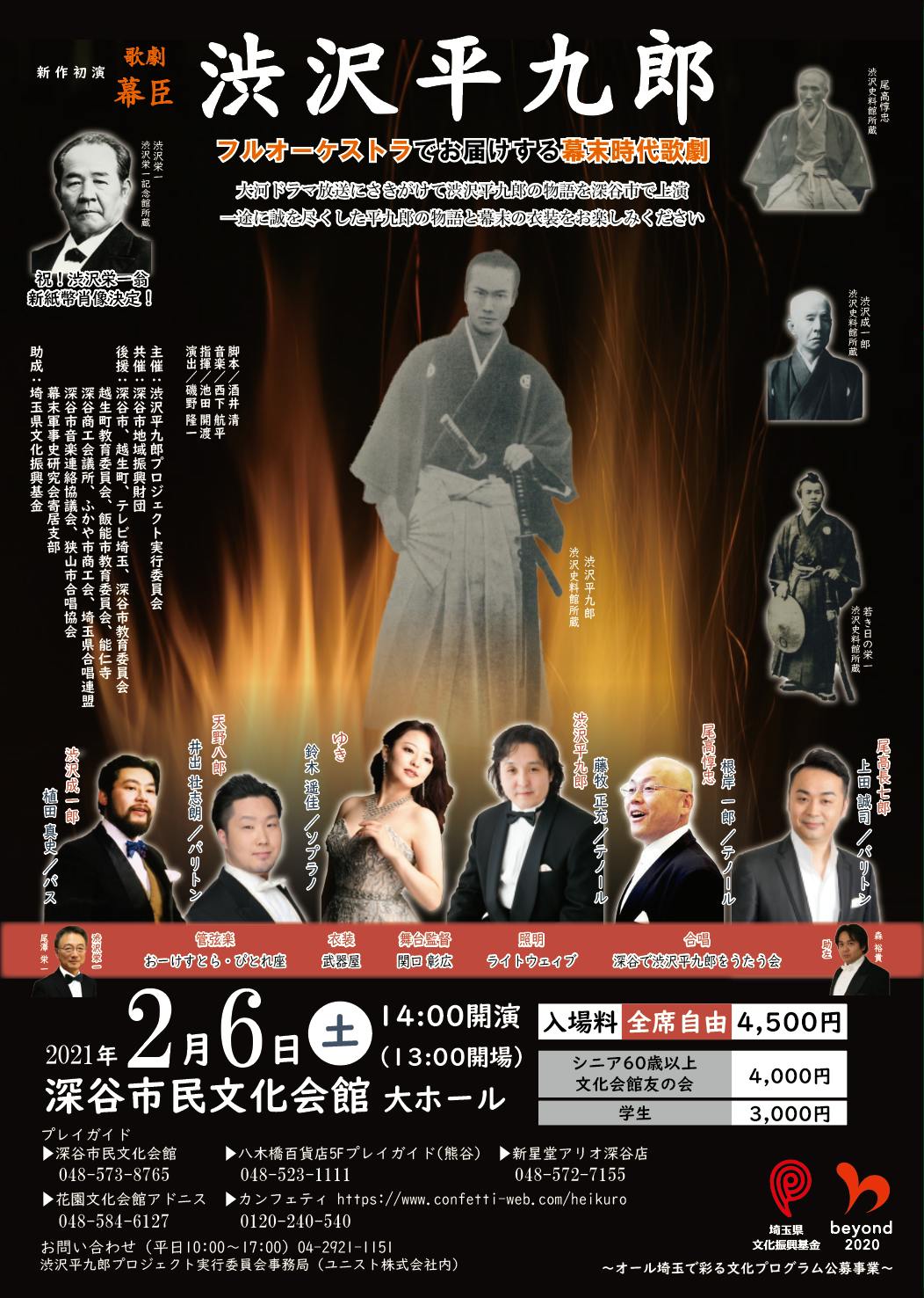 この公演の翌週(2月14日)には、オペラにも登場する渋沢栄一を主人公としたNHK大河ドラマ「青天を衝け」が始まります。渋沢家の若武者平九郎の時代歌劇に是非ともご支援をお願いいたします。
