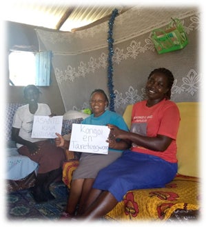 写真1彼女たちが持っている白い紙に注目してください。中央のボニスと向かって右のカロラインが持っているカードはキプシギス語。ボニスが手を添えエミリーが持っているのはスワヒリ語。どちらも「ご支援ありがとう!」という意味です。