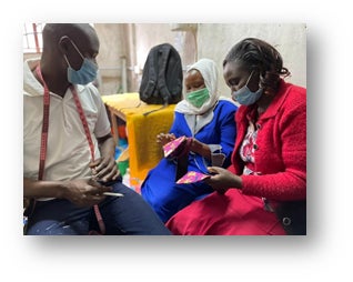 下の写真はRAHA KENYA製作現場での様子です。左、ジョセフさんに製品の説明を受けるボニス(左)とカロライン(右)。右、ボニスの作った布ナプキンのサンプルを見せて、ワンボーイさんにアドバイスを受けるカロライン。