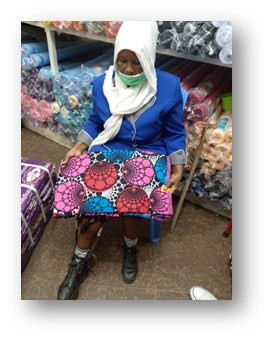 写真下は、ナイロビの問屋街を訪れ、Kitengeと呼ばれるアフリカ布を手にしたボニス。