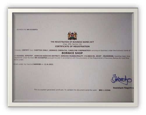 ビジネス登録は、Niko Nikoプロジェクトの主要な成果です。これを彼女たちは自分たちだけで成し遂げました。ナイロビへのスタディーツアーやボニス自身の縫製技術研修、それと同時進行でボニスによるエミリーとカロラインへの縫製訓練という忙しさを縫って、まずは納税者番号を取得し、町のインターネットカフェに足を運びビジネス登録のための書類を揃え、ケリチョーの役所に赴き、工面した登録料で申請というなかなか長い道のりだったようです。