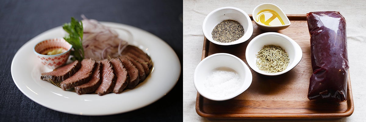 今回「北アルプスさいわい便」のために児玉さんが考えてくれたお料理は「ローストディア」と「鹿肉の赤ワイン煮」。味も見た目も本格的な、褒められ料理です。初心者には手を出しにくいジビエ料理だからこそ、失敗なくできて材料も手順もシンプルなレシピでお届けします。通常では出回らない信濃大町の鹿肉を、ミールキットでおいしくお召し上がりください。