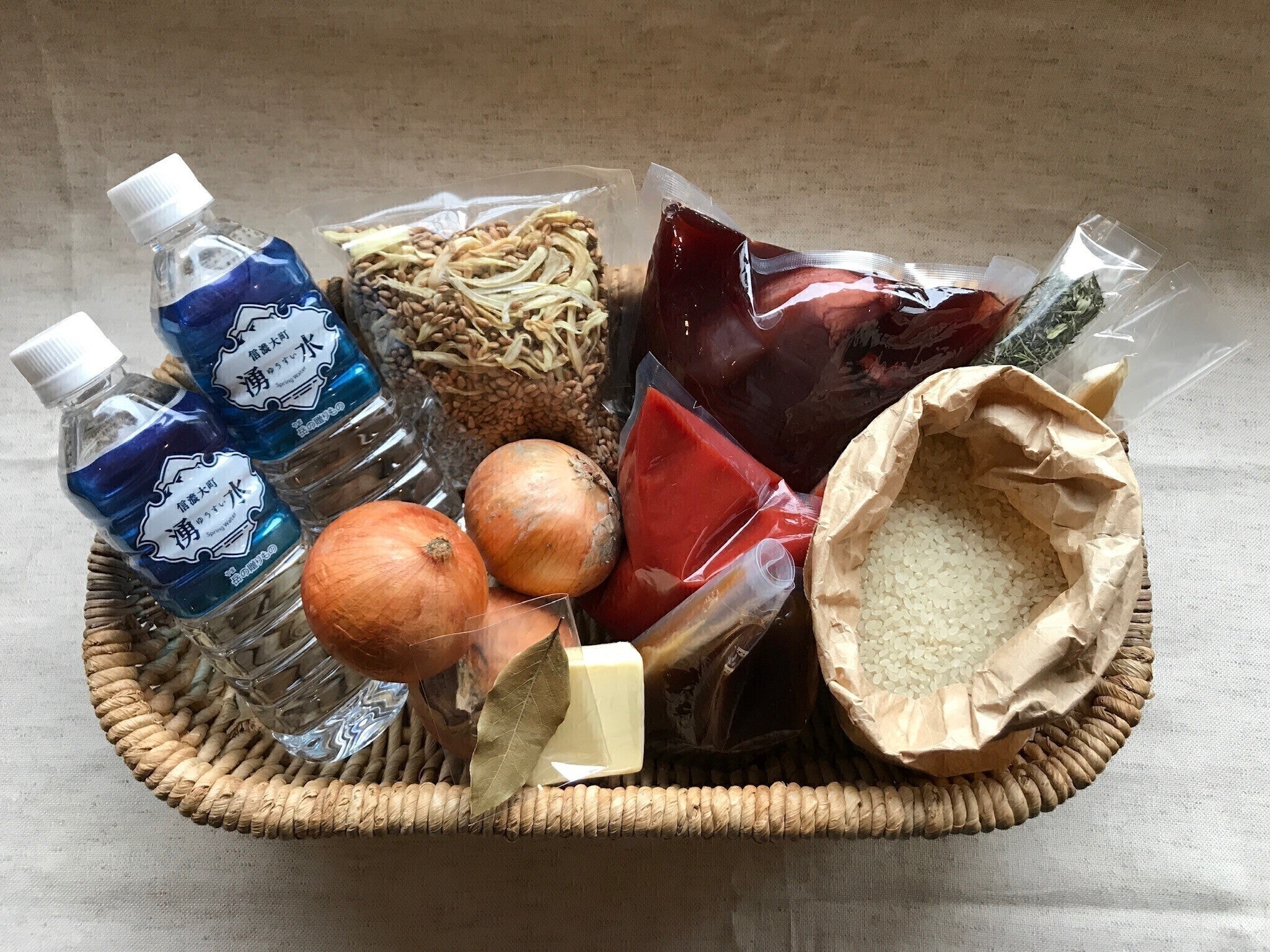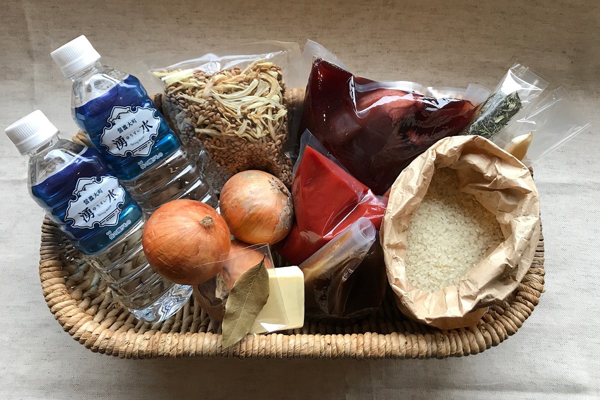 12000円コースのリターン「鹿肉の赤ワイン煮」と「玄麦リゾット」のお届け内容
