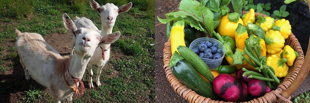 (左)「農園カフェ ラビット」に行くと出迎えてくれるヤギたち (右)畑でとれた夏野菜