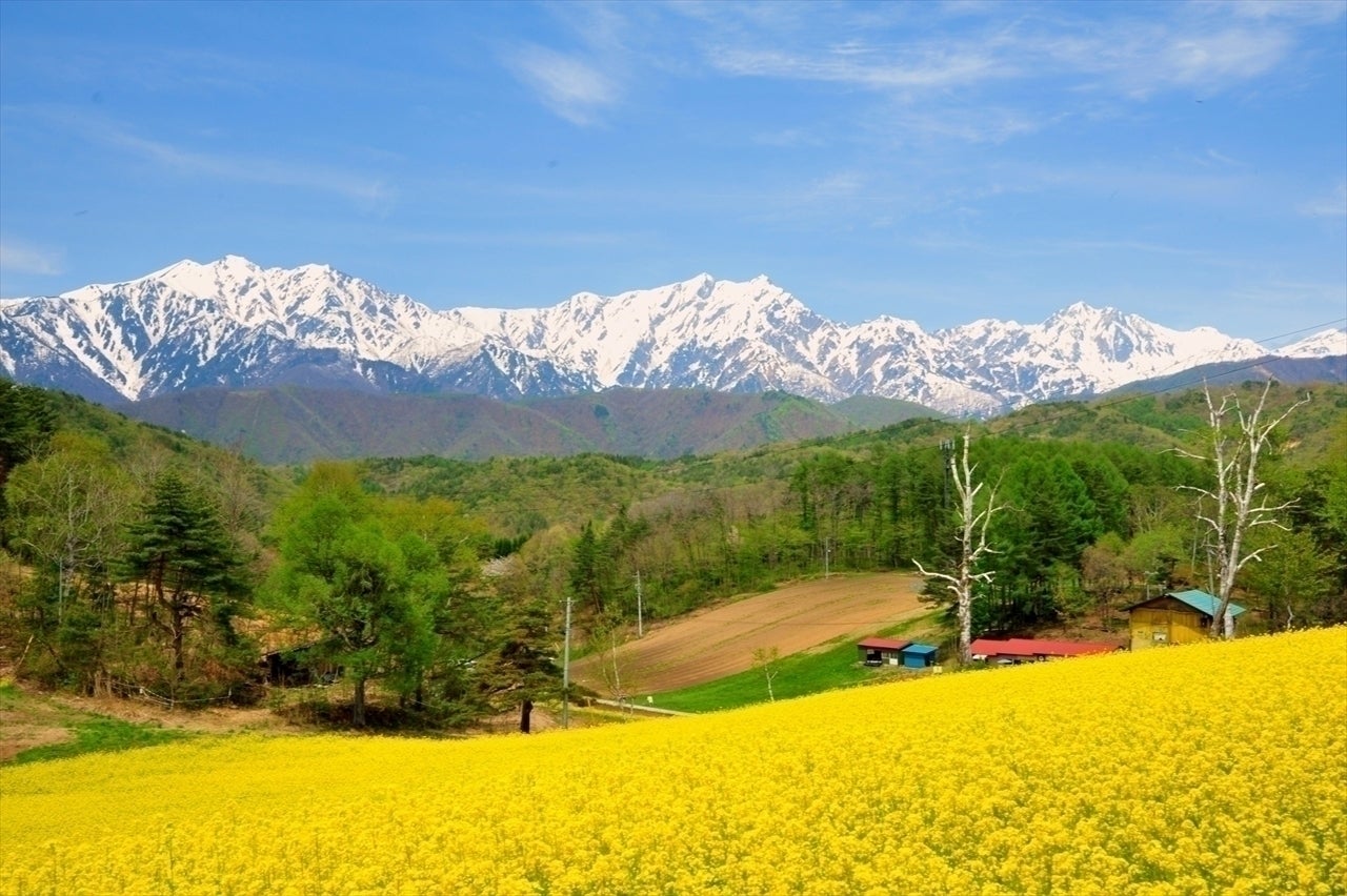 5月の中山高原から北アルプスを望む 奥の右側に見える赤い屋根が「農園カフェ ラビット」